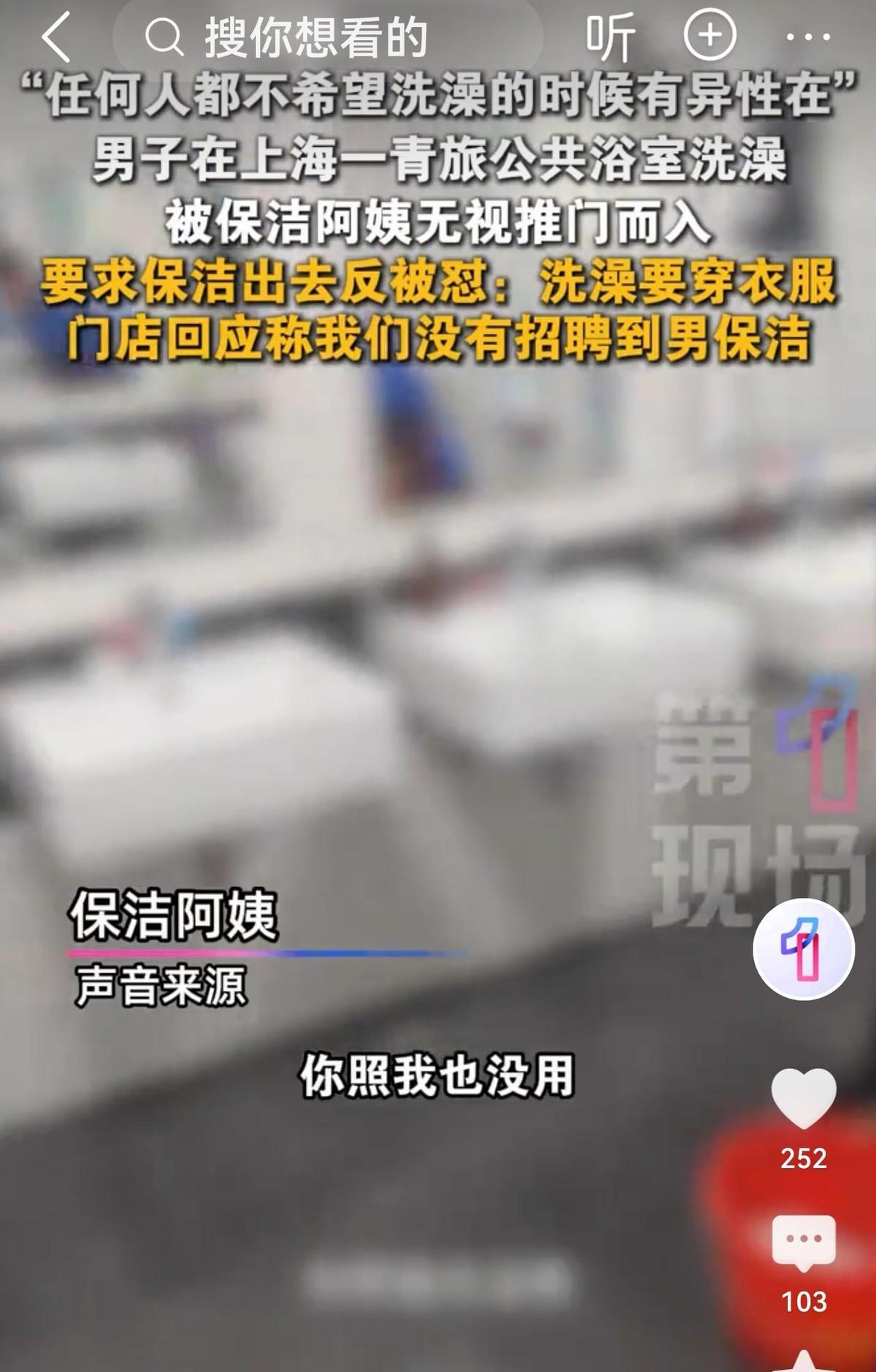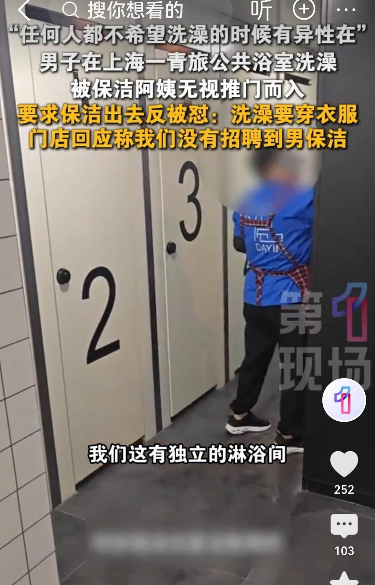 上海,男子在青旅洗澡时,保洁阿姨突然推门进来,男子让她出去,阿姨却不肯,还振振有