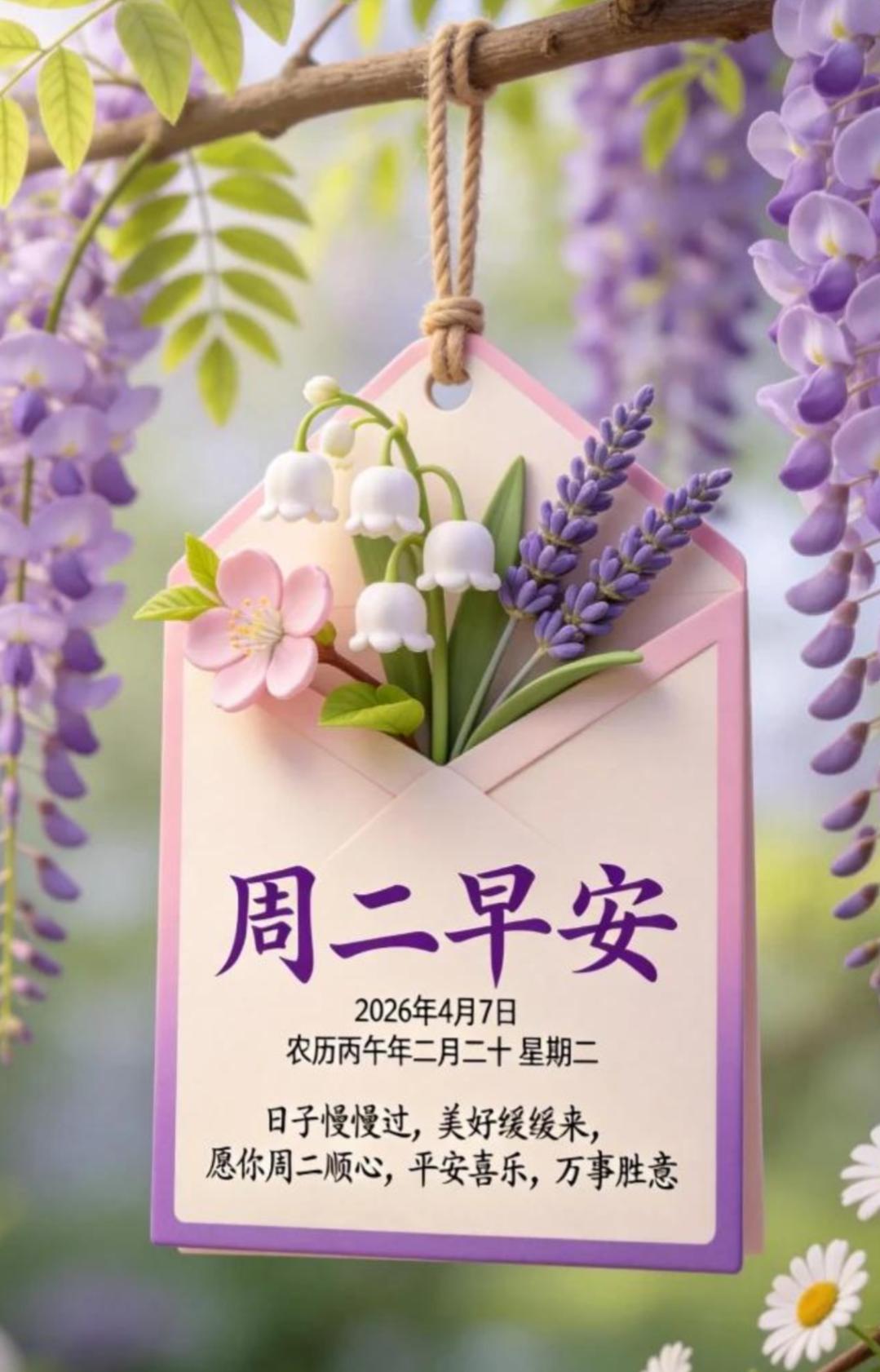 ☀️🍃早上好!把清晨的问候藏进春风,把美好的期许写进时光。愿你今日无烦恼,满心皆欢喜,事事皆顺意,岁岁常安康。周二愉快!💖🎈😊