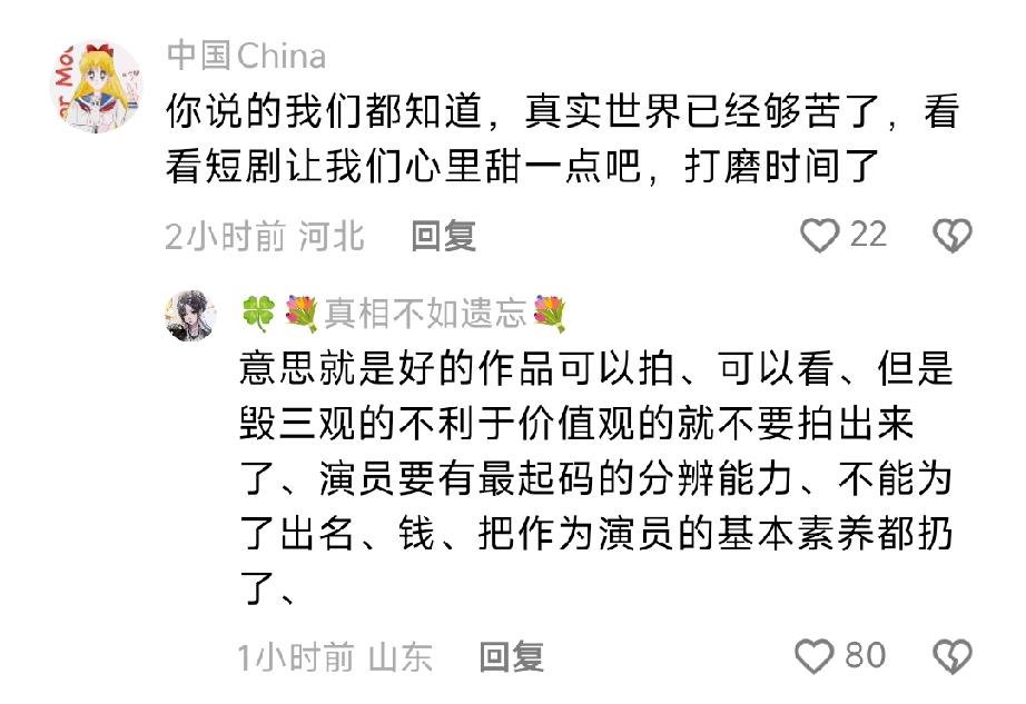 何赛飞批评短剧时,刘晓庆如坐针毡吧 何赛飞讲很多短剧都是什么“嫁入豪门即成功”,什么霸道总裁强制爱…… 立意明显是有问题的,对青少年有不良影响的,她认为制作方和演员应该要杜绝和筛选,而不是一味地讲赚钱,演员不接某部剧也不是马上就要饿死。 做人做事要有选择,有原则,这大概就是老艺术家的职业操守和道德修养吧[赞]。 刘晓庆不服老是好事,但接一些明显不符合现实的夸张短剧,要说不是为了钱,而是为了体验,其实是有点虚伪的。 网友: 刘某庆老师还在边上呢?这不打脸吗? 某些成年人爱看导致某些导演制片人就拍这些,接着某些青少年也跟着一起看 看着看着价值观就被无意间引导扭曲了,长远看就是百害而无一利的。支持何老师[赞] 人在利益面前如果能保持正确的心态很难 何赛飞