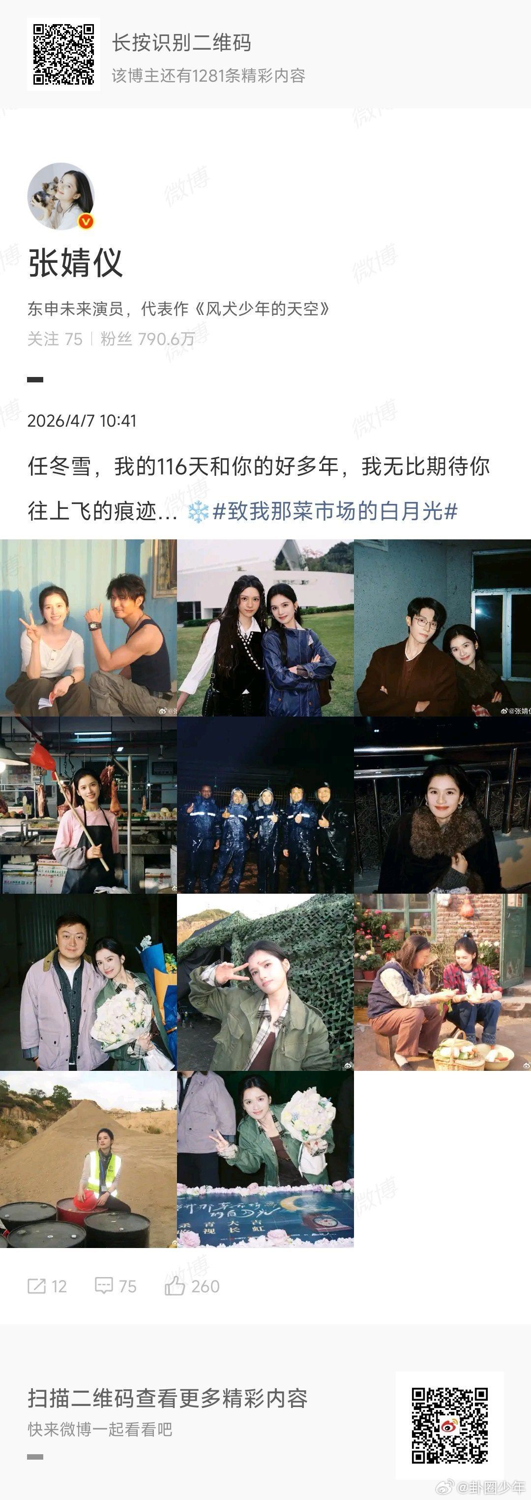 张婧仪致我那菜市场的白月光杀青恭喜张婧仪《致我那菜市场的白月光》顺利杀青,期待早日与任冬雪相见!