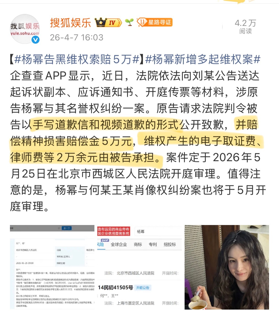 杨幂告黑维权索赔5万 搜了下黑子的xhs主页还是个学法的呢,知法犯法 支持杨幂维权,对任何造谣抹黑杨幂女士的行为,必须坚持零容忍的态度,维权到底绝不姑息,以后都要以5万起步的标准!!这次是🍠平台,还有微博等众多平台都在告黑!