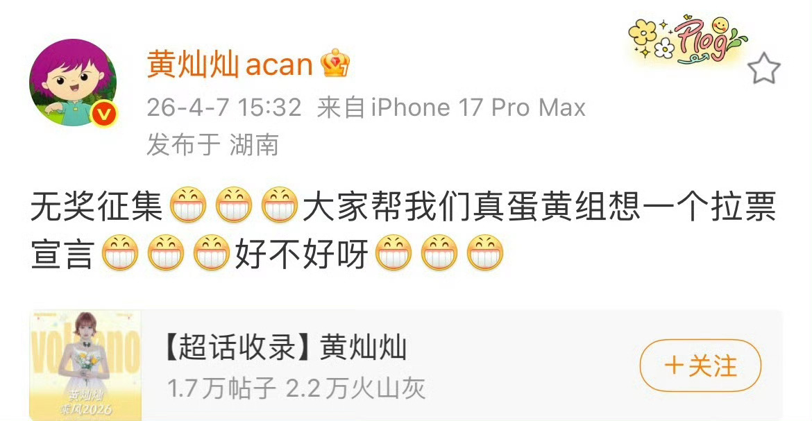 黄灿灿5G冲浪中🌊发文求助网友为真蛋黄组想一个拉票宣言,机会难得死脑子快想啊!