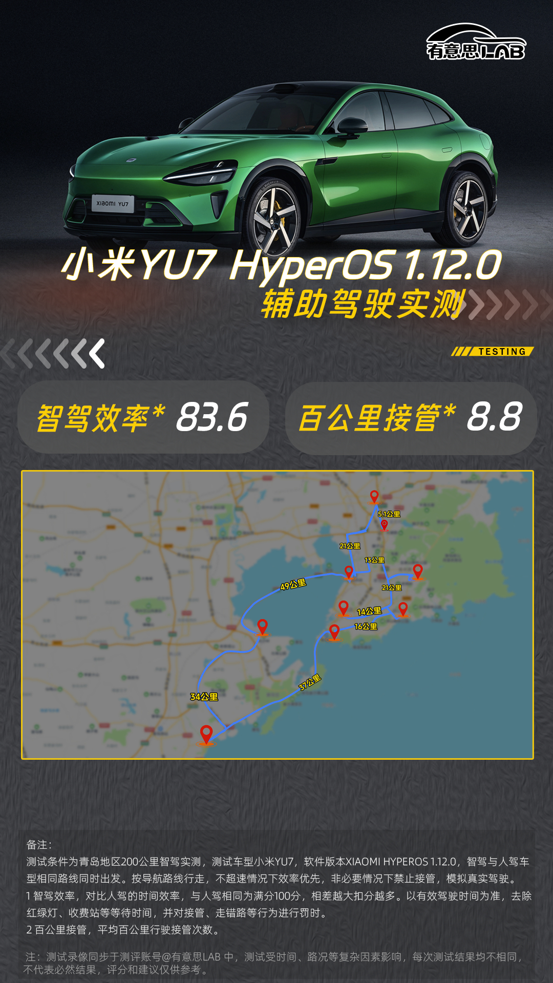 测试结果:小米YU智驾效率分83.6分,百公里平均接管次数8.8次