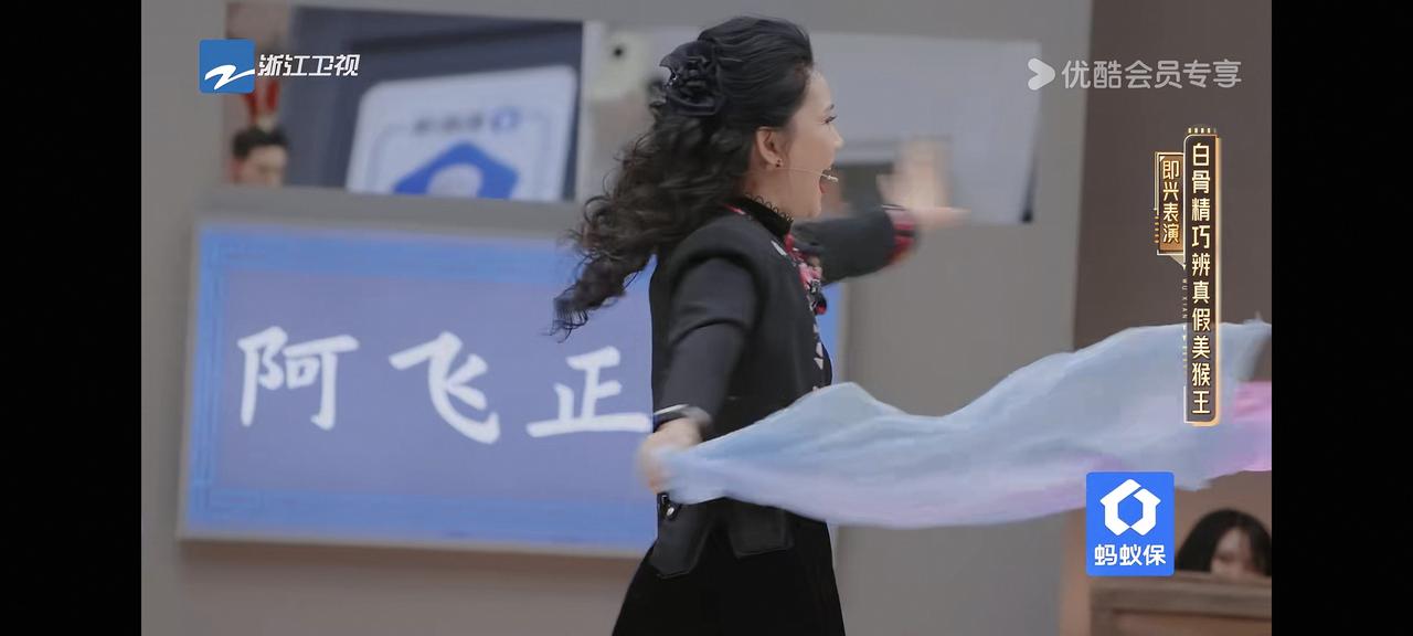 她一出场,带着纱巾,飘着进来的。美猴王说她“老”,她立刻翻脸,说重新再来。