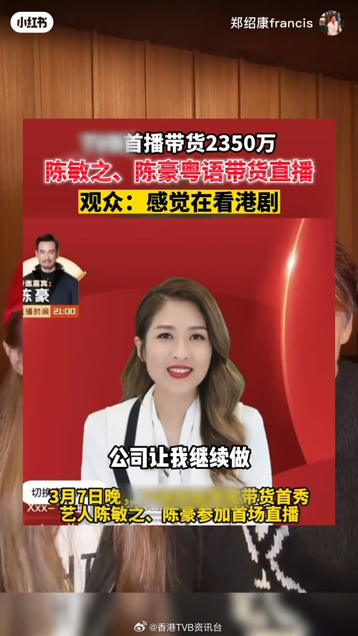 陈敏之转型直播带货吸金陈敏之透露自己做直播已有12年,其中3年在内地发展。她回忆内地首场直播就连续播了7小时,也因此一战成名,公司决定让她从演员、主持人全面转型做直播。最忙的时候一个月直播十几天,常常讲到声音沙哑、身体极度疲惫。