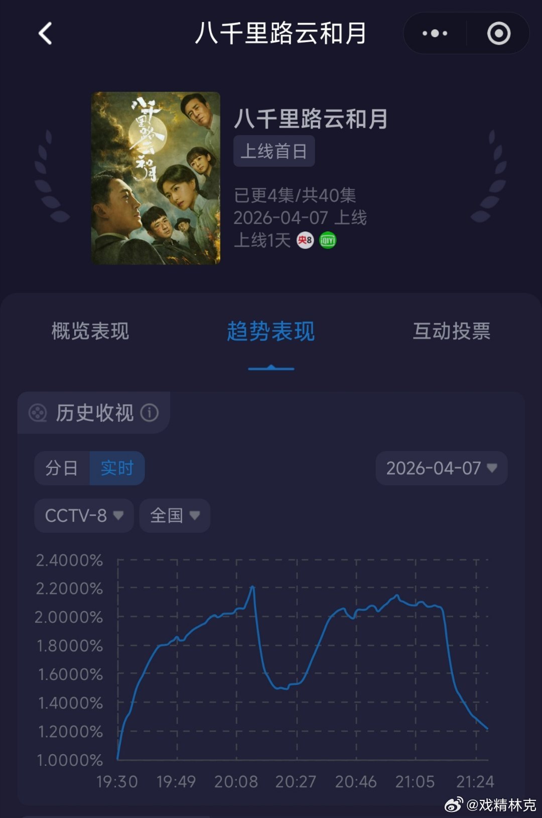 八千里路云和月 首日酷云收视率均值1.80+,峰值2.20+,有点低了。均值和生