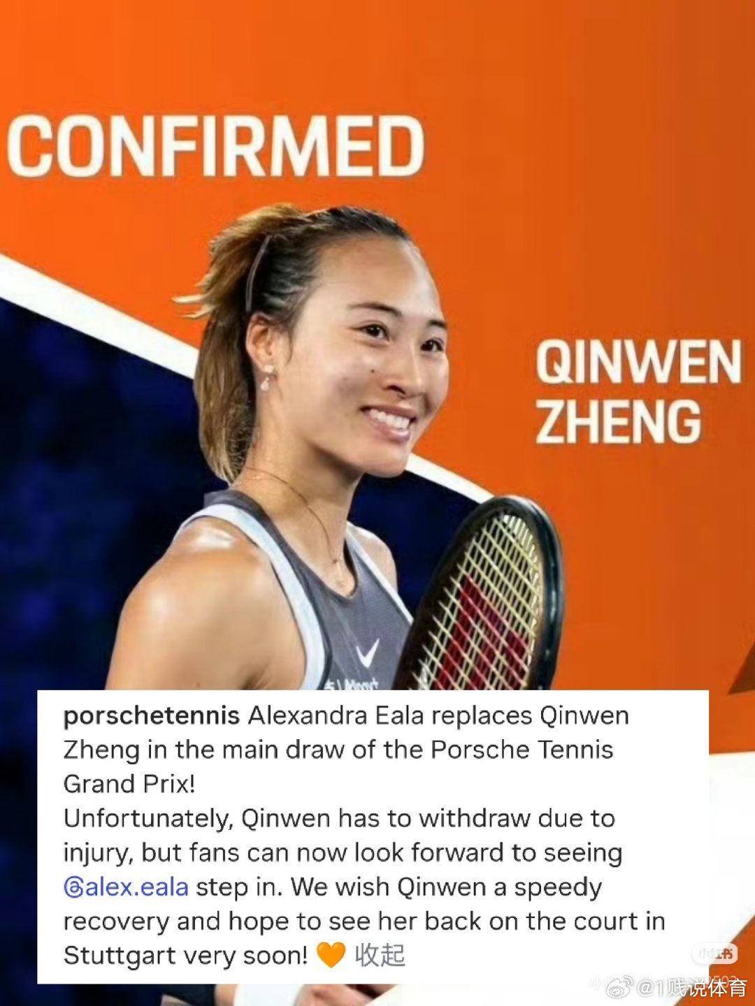 郑钦文退出斯图加特站【突发】郑钦文退出WTA500斯图加特站刚刚斯图加特官方宣布郑钦文因伤退赛。虽然看不到钦文了,祝福钦文早日健康回归❤️保时捷网球大奖赛官方:伊埃拉将顶替郑钦文,出战保时捷网球大奖赛正赛!很遗憾,郑钦文因伤不得不退赛,但球迷们现在可以期待伊埃拉替补登场。我们祝愿郑钦文早日康复,期待她很快重返斯图加特的赛场!💛郑钦文退出斯图加特赛