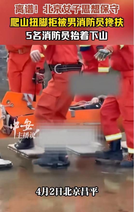 离谱!北京昌平,女游客爬山扭了脚,打了救援电话,但消防员来了以后,这位小仙女却以“男女授受不亲”为由死活不让碰。最后逼得5个消防员没办法,只能用担架、把她抬下山,累得满头大汗。