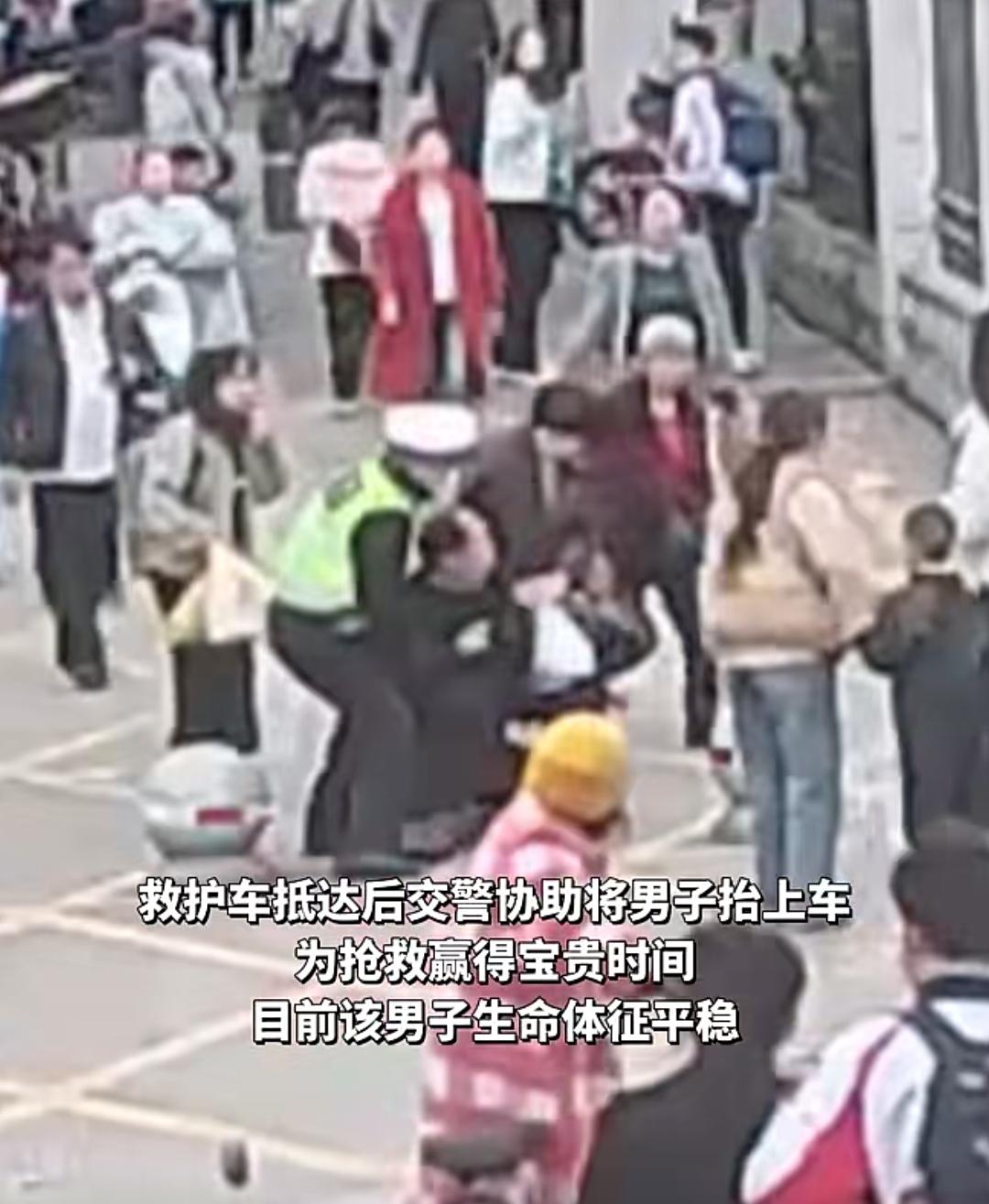 人来人往的湖北十堰街头,一名中年男子突然倒地,四肢抽搐、意识丧失,情况万分危急。就在这生死瞬间,执勤交警的秒级反应,上演了一场教科书式的紧急救援,成功从死神手里抢回了一条生命。 监控画面里,男子毫无征兆地栽倒在地,身体不受控制地抽搐,周围路人瞬间围了上来,却都手足无措。不远处的交警几乎是同时发现险情,没有丝毫犹豫,第一时间飞奔到男子身边,小心翼翼地将他平稳放倒,避免二次伤害。 一边是男子持续抽搐的危急状况,一边是拥堵的人流车流。交警一边守护在男子身边,轻声安抚,一边同步联系家属、组织群众拨打120,每一个动作都精准果断,为抢救抢下了黄金时间。救护车抵达后,交警又协助医护人员将男子抬上救护车,全程无缝衔接,为生命接力。 最终,因救助及时,男子成功转危为安,生命体征恢复平稳。这一幕,让无数网友直呼安全感拉满!我们总说,哪有什么岁月静好,不过是有人替我们负重前行。这些交警,就是我们身边最坚实的守护,是车流人海里最安心的那抹荧光绿。 他们没有超能力,却用专业和担当,在危急时刻撑起了生的希望;他们不是超人,却用本能的善良,守护着每一个陌生人的平安。这就是中国交警,用一次次挺身而出,温暖着整座城市,守护着万家灯火。 为这群最可爱的人点赞,也愿每一个人都能被温柔守护,每一次意外都能逢凶化吉。十堰街头