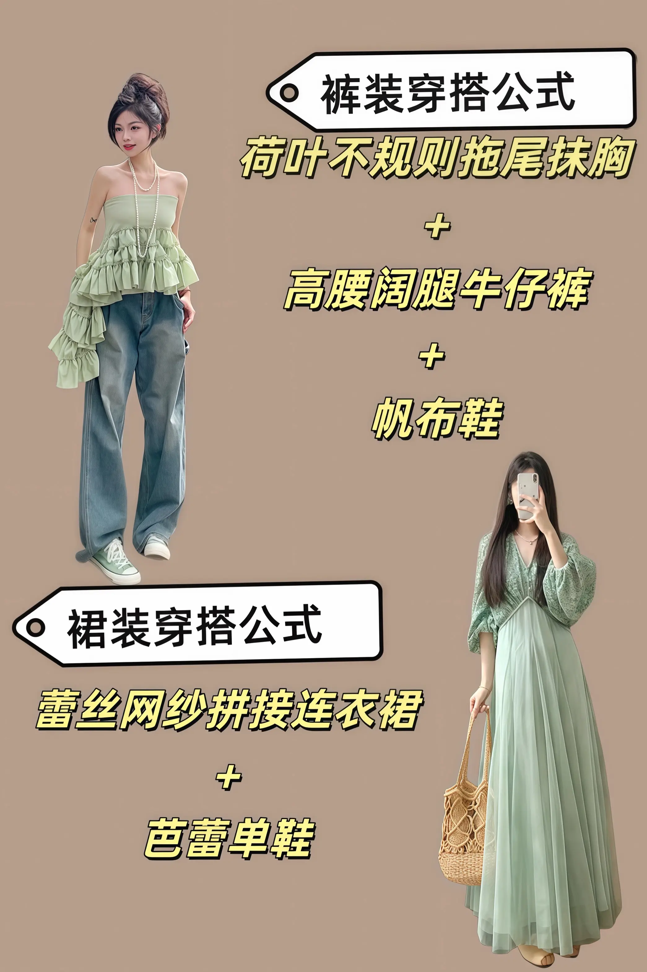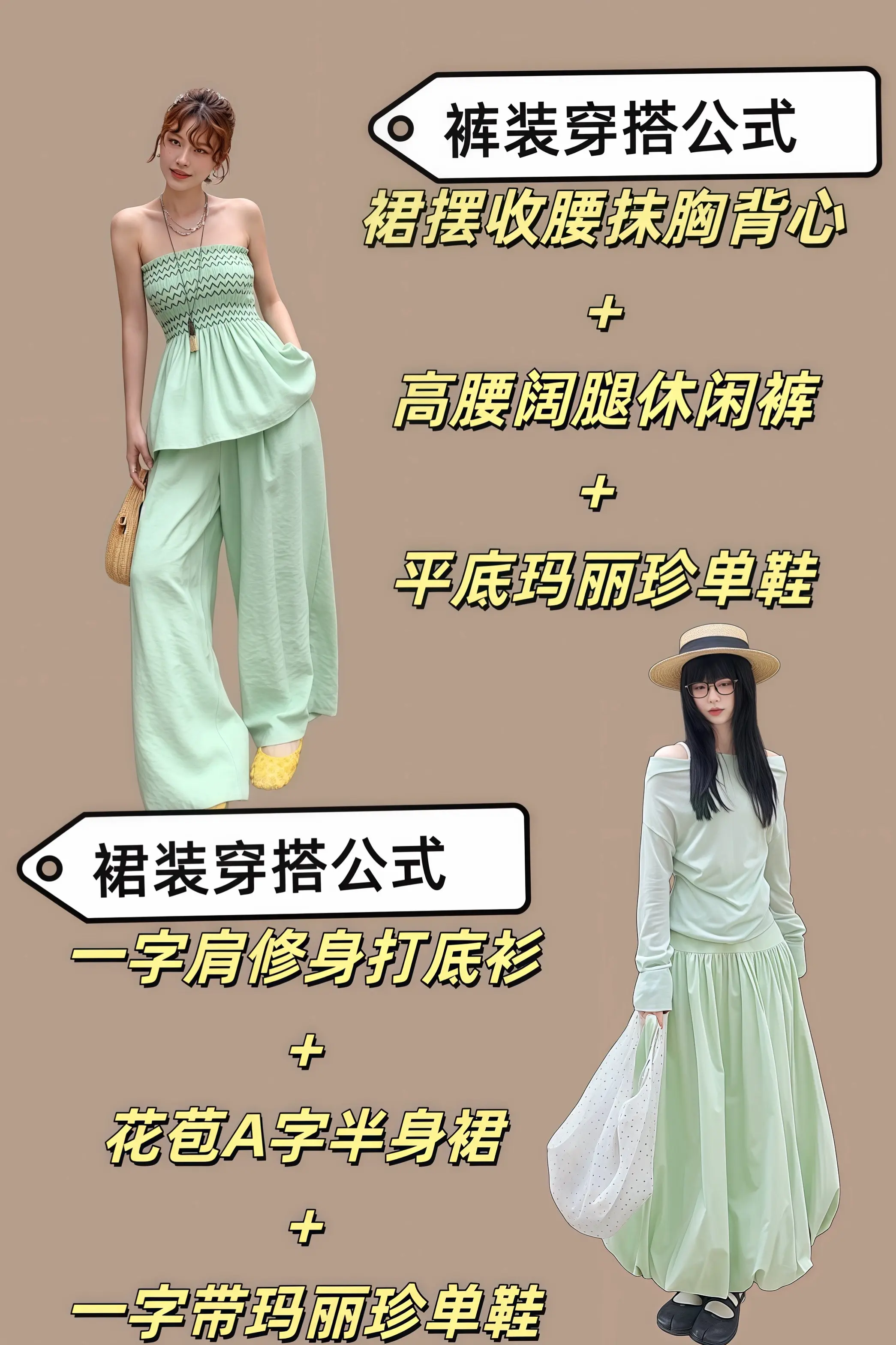 这套穿搭是清新甜美的“休闲+轻甜”组合,很有春日活力感:-上衣选了薄荷绿