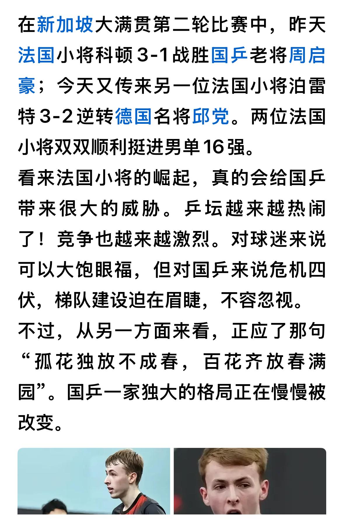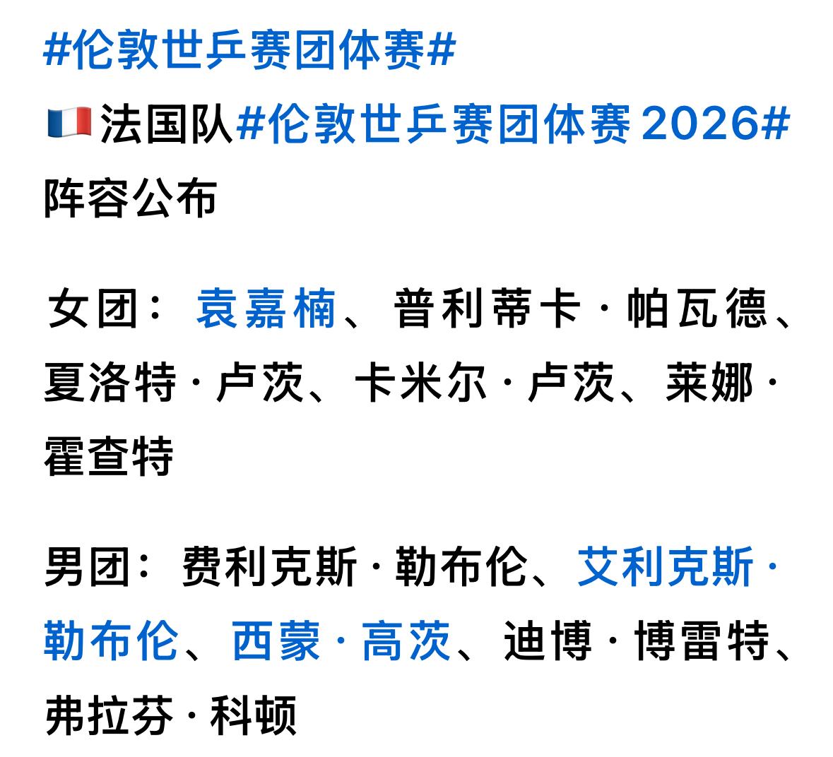 4月8日法国队公布伦敦世乒赛参赛名单: 男队:小勒布伦,大勒布伦, 西蒙高茨,泊雷特,科顿 女队:袁嘉楠,帕瓦德, 夏洛特.卢茨,卡米尔.卢茨, 莱娜.霍查特 整体来说,法国队女队实力一般, 42岁袁嘉楠一个人顶一单, 帕瓦德担当二单,三单实力较弱! 法国男队的实力明显增强, 勒布伦兄弟的实力毋庸置疑, 西蒙高茨是状态型选手, 如果打疯了,也不好压制。 特别是法乒成长起来的小将, 泊雷特和科顿, 泊雷特与大布在刚刚结束的世界杯 拼到最后一刻, 科顿在今年的新加坡大满贯打败 周启豪, 泊雷特打败邱党, 也就是说,法国男队的整体实力强, 拼的不仅仅是一单和二单的实力, 三单也特别重要! 假如国乒队VS法国队, 王楚钦VS小勒布伦 林诗栋VS大布 周启豪(向鹏)VS科顿(泊雷特) 想一想都非常难, 而且王楚钦赢小布也非常不容易, 现在我唯一的希望就是国乒男队 确定男队第五人, 梁靖崑或是温瑞博! 希望法国队能在半决赛中遇到日乒男队,那就OK,万事大吉啦