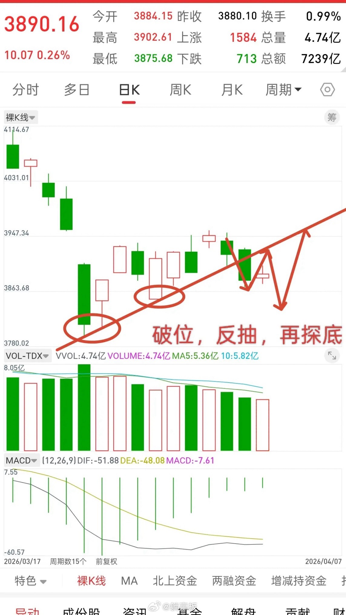 而且从短期来看,大盘还不一定往下去,反而很可能先反抽到短期上升趋势破位的地方,大概3930-3940左右,然后再来一波二次探底,这样又能洗一波盘。