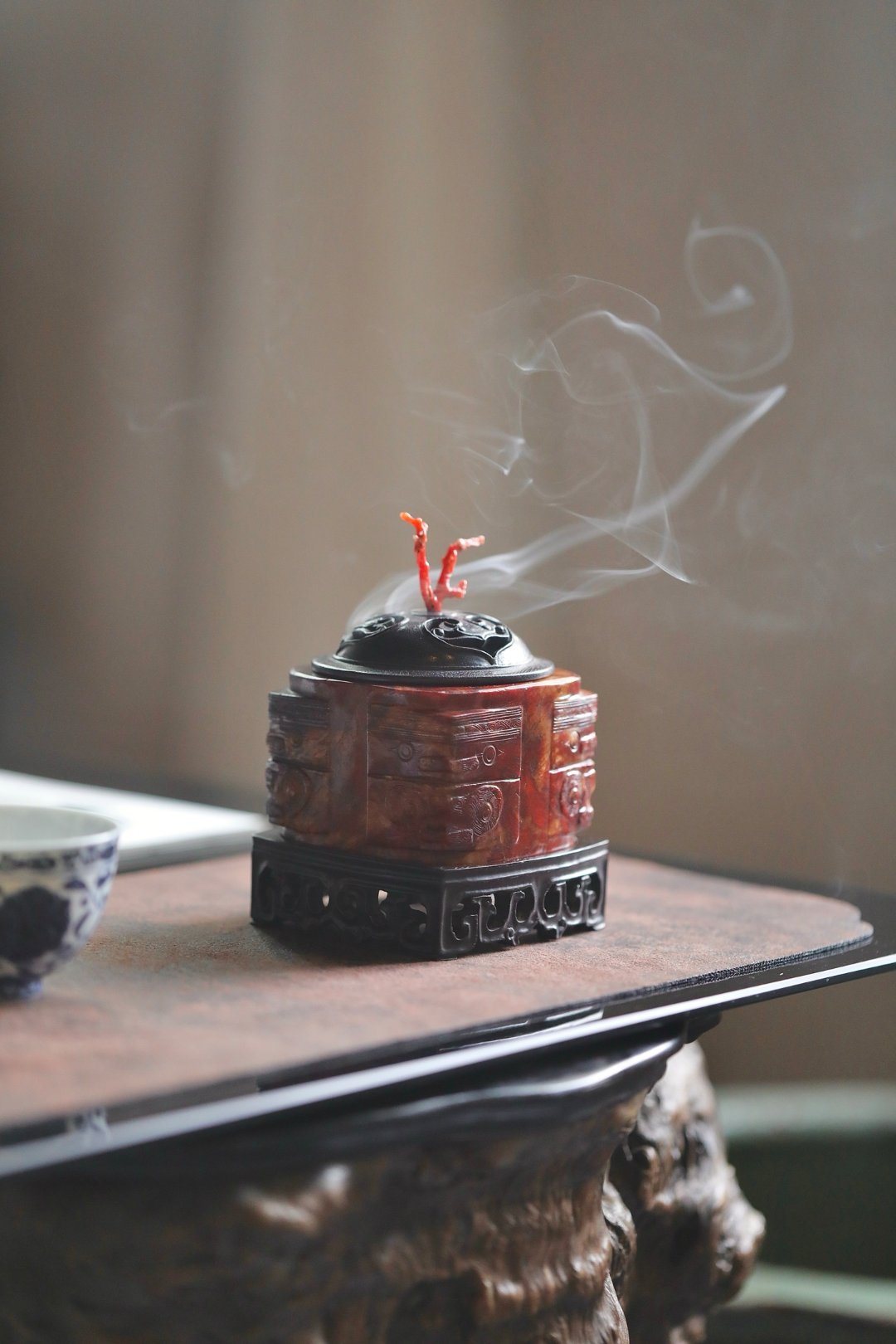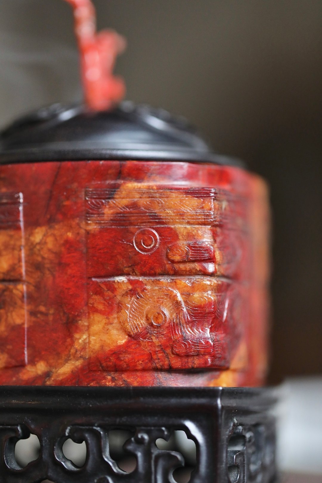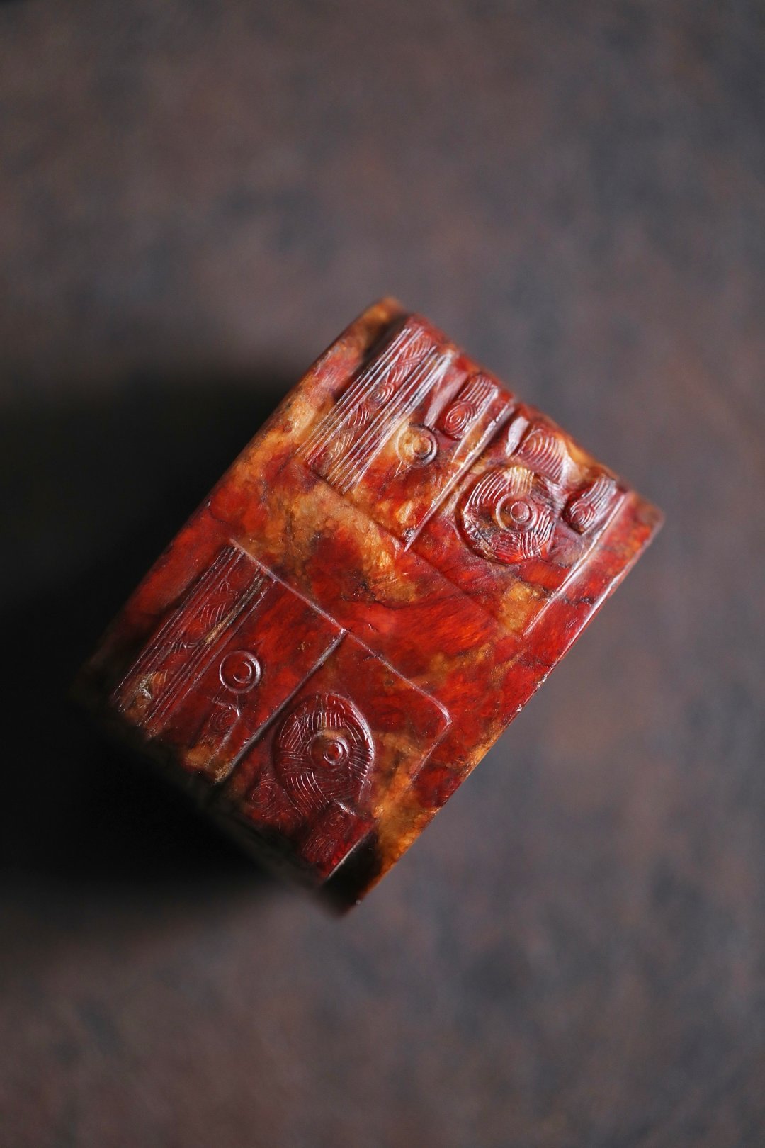 仿商周玉琮之形制,器作方柱,线条刚劲规整,尽显古礼之庄严。器身满工雕刻仿古兽面纹、回纹,刀工精湛,线条流畅,纹饰古朴,复刻千年古玉神韵;玉质温润,红沁入骨,历经岁月沉淀,更添古意盎然。