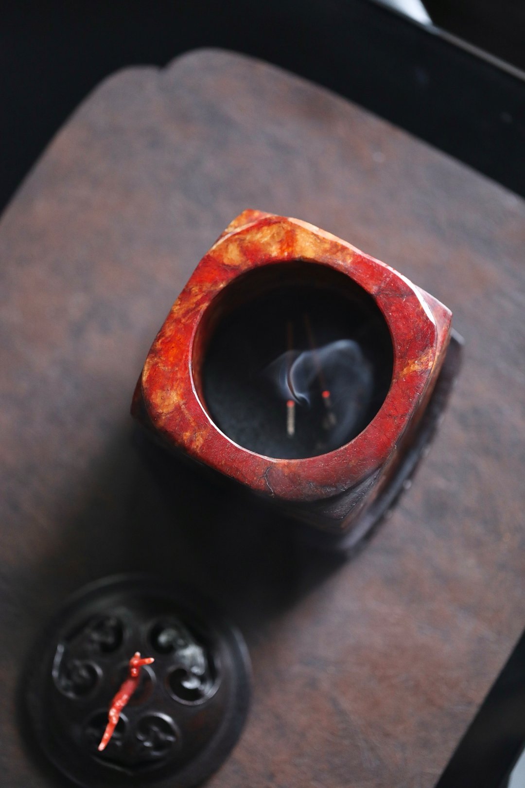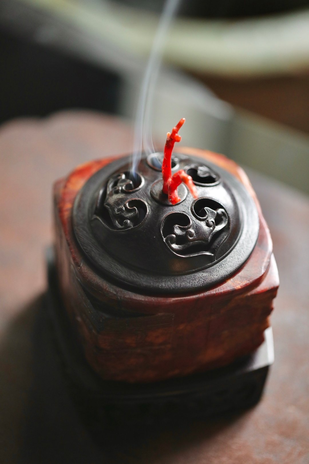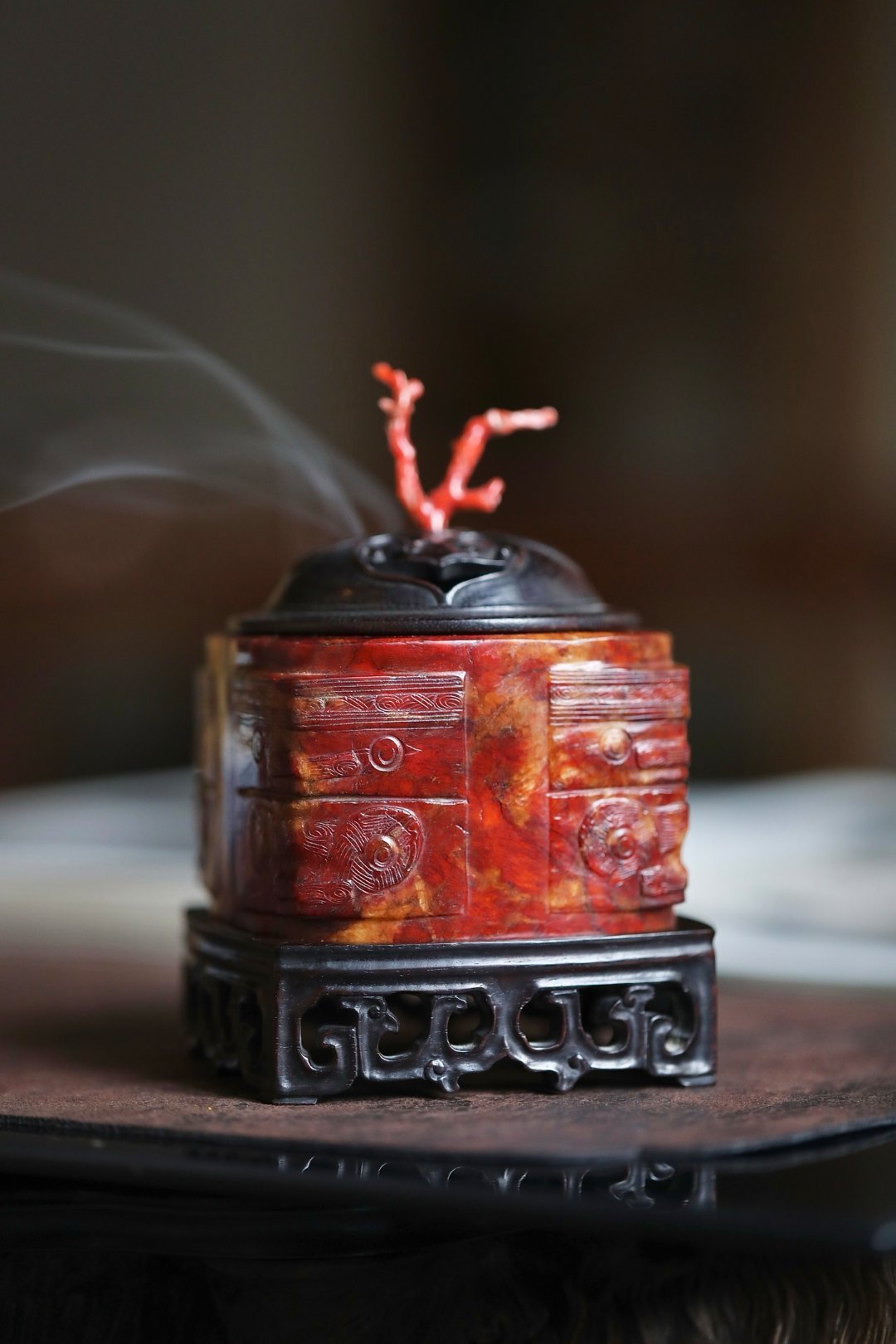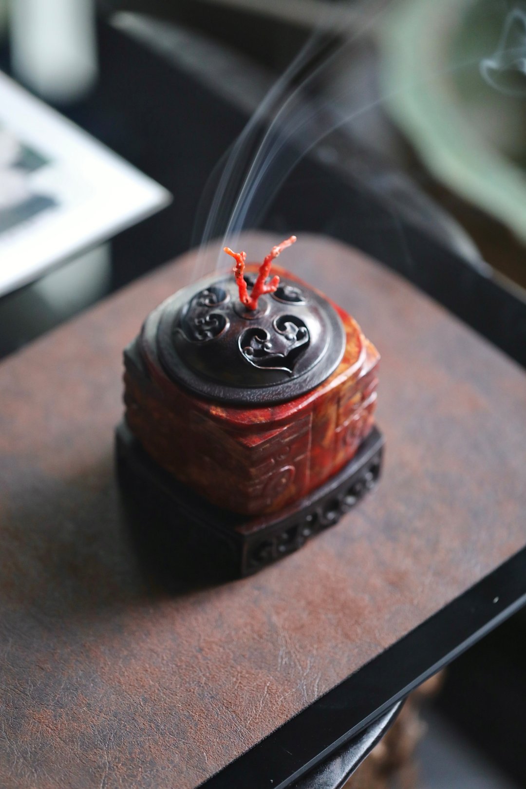仿商周玉琮之形制,器作方柱,线条刚劲规整,尽显古礼之庄严。器身满工雕刻仿古兽面纹、回纹,刀工精湛,线条流畅,纹饰古朴,复刻千年古玉神韵;玉质温润,红沁入骨,历经岁月沉淀,更添古意盎然。
