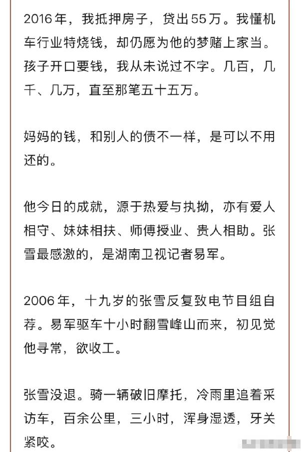 张雪说自己小时候过的特别惨,住的房子都是茅草搭的窝棚,不挡风也不挡雨,然而他的妈妈却是知名作家,出版了很多作品,是一个不差钱的高知女性。 在当下功利化的网络环境里,张雪的出现就像一束刺眼的光,打破了流量裹挟下的浮躁,也让我们看到了一个草根最动人的挣扎与坚守。 很少有人能想到,这个如今为国争光、在机车领域闯出一片天的汉子,小时候住的是连风雨都挡不住的茅草窝棚,而他的母亲何琼,却是出版过多部作品、经济优渥的知名高知作家,这样的反差,本身就藏着一段不为人知的过往。 张雪1987年出生在湖南涟源市白马镇的姥姥家,在他和妹妹还很小的时候,父母就选择了离婚,之后两人都外出打工,把两个孩子丢给了奶奶照顾。 那些年,张雪和妹妹住的是简陋的茅草窝棚,刮风时漏风,下雨时漏雨,日子过得捉襟见肘,连基本的温饱都要格外节俭。 可谁能想到,他的母亲何琼,彼时已经是小有名气的作家,手里有不少作品,经济条件远优于当时的普通家庭,完全有能力给孩子们一个安稳的生活。 一边是高知作家的优渥生活,一边是孩子在茅草窝棚里的窘迫,这样的落差,实在让人难以理解。 小时候的张雪,骨子里就带着一股不服输的闯劲,调皮又爱折腾,喜欢把身边能拆卸的东西都拆个遍,甚至在和伙伴们划船时,故意把船摇得快要翻过来,吓得同行的人哭出声,他自己却傻乐。 姥姥看着这个天不怕地不怕的外孙,常常担心他太能惹事,以后难以长大。 可就是这份“折腾”,藏着他骨子里的韧劲,也为他后来的发展埋下了伏笔。 张雪的舅舅和表姐,提起他小时候的模样,至今都记忆犹新,谁也没想到,当年那个爱闯祸的调皮鬼,长大后能靠修摩托车起家,一步步闯出自己的天地,成为整个家族的骄傲。 随着张雪名气越来越大,他的母亲何琼也终于出现在公众视野里,撰写文章讲述自己和张雪的故事,把自己塑造成一个为了养家糊口、远赴海南做编辑的好母亲。 她坦言,自己刚到报社工作时工资不高,但每个月都会按时打钱给张雪和妹妹,供他们读书生活,还说自己从未缺席过儿子的成长。 后来张雪骑车撞人,是她拿出3万元赔偿对方,没有责备儿子一句;2016年张雪创业,她更是抵押了自己的房子,贷款55万元借给儿子,还说母亲的钱不用还,相当于拿出了自己的全部身家支持儿子追梦。 何琼现在已经再婚,丈夫是福建人,她也回到了张雪身边,说自己和儿子的感情一直很好,经常沟通,还评价张雪是个有担当、对认定的事力求极致的人,而且对物质要求极低,平时不穿名牌、不会开车,要么骑摩托,要么让妻子接送,日子过得十分简单。 可何琼的这些说法,却引来了不少网友的质疑。 因为张雪曾公开表示,母亲在他小时候离婚改嫁后,一年只和他们联系一次,从来没有给过他们关心和经济支持,那些年,他和妹妹全靠奶奶拉扯长大。 在张雪籍籍无名、最需要陪伴和支持的时候,何琼从未露面;等到张雪功成名就、被所有人关注的时候,她才出来邀功,这样的做法,难免让人觉得功利。 更让人不适的是,何琼用高度文学化的华丽语言,描述张雪那段草根出身、带血带汗的奋斗史,读起来不像在说自己的儿子,反而像一篇生硬的颁奖词,显得格外割裂、不真实。 张雪的成功,从来不是靠母亲口中的“托举”,而是靠自己一路摸爬滚打,还有那些真正在他低谷时伸出援手的人。 湖南电视台的记者早年对他的采访,让这个出身贫寒的年轻人被更多人看到,为他后续的发展铺好了道路;而他的师父牙哥,更是他生命中的伯乐,不仅发现了他的造车天赋,指明他去重庆造车,还拿出自己的积蓄支持他,甚至抵押自己的冠军头盔为他站台,在他多次陷入困境时,始终坚定地站在他身边。 牙哥的支持,是发自内心的欣赏与信任,和那些在人红后才出现的‘关心’,有着本质的区别。 更让人敬佩的是,张雪从来没有被眼前的利益困住脚步。 他曾是凯越的大股东,在凯越最赚钱的时候,因为和公司创始人在研发理念上产生分歧——他执着于钻研摩托车发动机,想要突破国产机车的核心技术壁垒,而对方更注重市场扩张,不愿冒险投入研发,加上他的研发提案多次被董事会否决,甚至被免去总经理职务,心灰意冷之下,他选择了净身出户,放弃了手中所有的股份和分红,带着几个老工程师,继续追寻自己的研发梦想。 很多人说他“缺心眼”,放着好好的钱不赚,非要去啃技术这块“硬骨头”,可只有张雪自己知道,钱从来不是他的追求,研发出属于中国的顶级机车,才是他毕生的信仰。 如今的张雪,已经成为网络上的一股清流,在大家都追捧考研名师张雪峰的大环境下,他用自己的经历,诠释了什么是真正的正能量。 张雪的可贵,在于他吃过苦,却从未被苦难磨平棱角;在于他有了名气和财富,却依然保持本心,不被功利化的风气所裹挟。