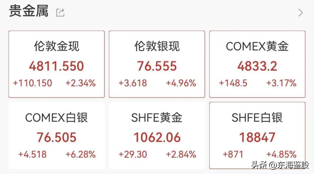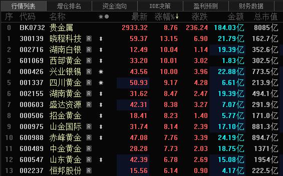 贵金属概念股快速拉升,中国央行连续17个月增持黄金! 西部黄金涨停,晓程科技、山金国际、盛达资源等跟涨。 消息面上,现货黄金突破4800美元/盎司,日内涨2.34%;现货白银突破76美元/盎司,日内涨4.96%。 此外,中国央行公布数据显示,中国3月末黄金储备报7438万盎司,环比增加16万盎司,为连续第17个月增持黄金。 中金指出,未来数月全球主要经济体通胀或明显冲高,增长面临下行风险,全球资产可能迎来新挑战。 中金预测美国通胀下半年重新回落,叠加增长压力与金融风险,美联储下半年仍可能继续降息,中期来看美联储宽松交易有望回归,为股债金等资产表现提供新支撑,尤其看好中国股票中长期表现。从胜率视角来看,黄金短期配置价值相对其他非现金资产占优。