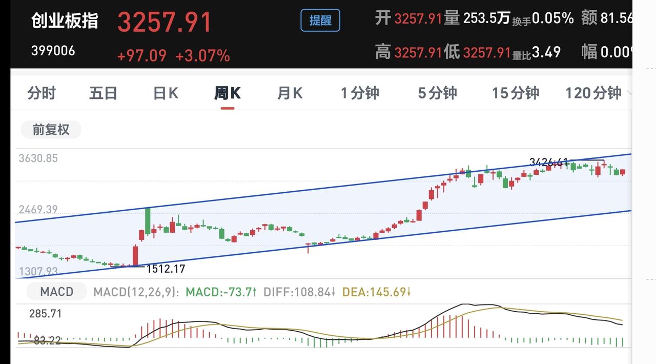 看下面的截图5,这是创业板指周K线图,创业板指周级别处于上涨通道中,今天的上涨并没有改变创业板指周线级别的上涨趋势,而且,距离上涨通道的下轨线更远,也就更加不容易改变创业板指周线级别的上涨趋势。