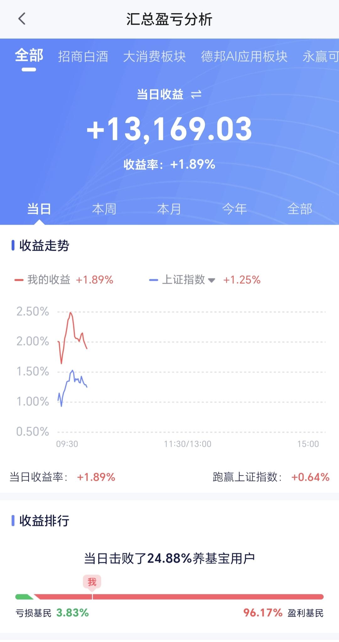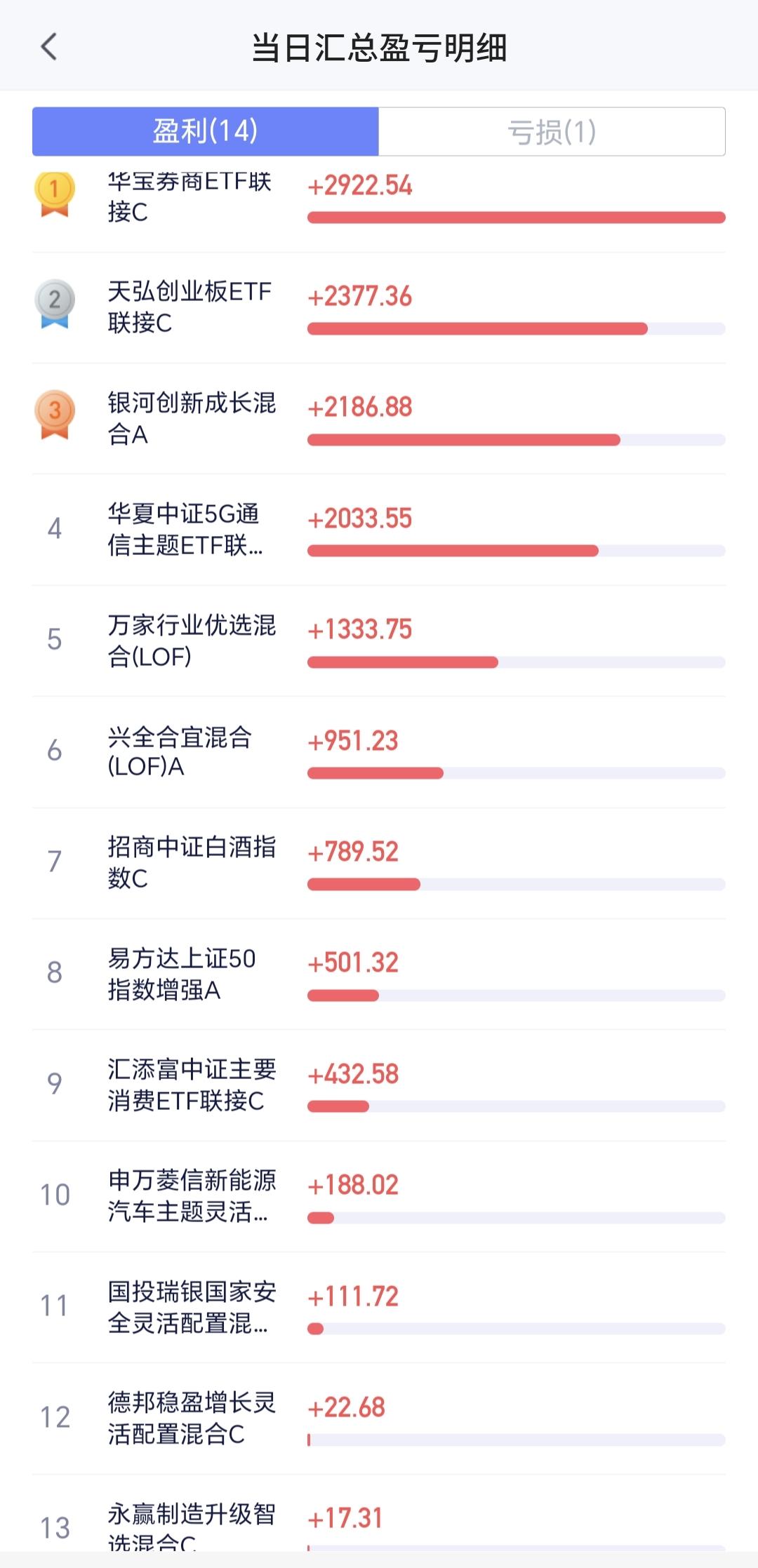 持有基金现在盘中估值上涨了13169元,盈利金额最大的三个板块是:证券板块,创业板指,芯片半导体板块,亏损的只有创新药板块。