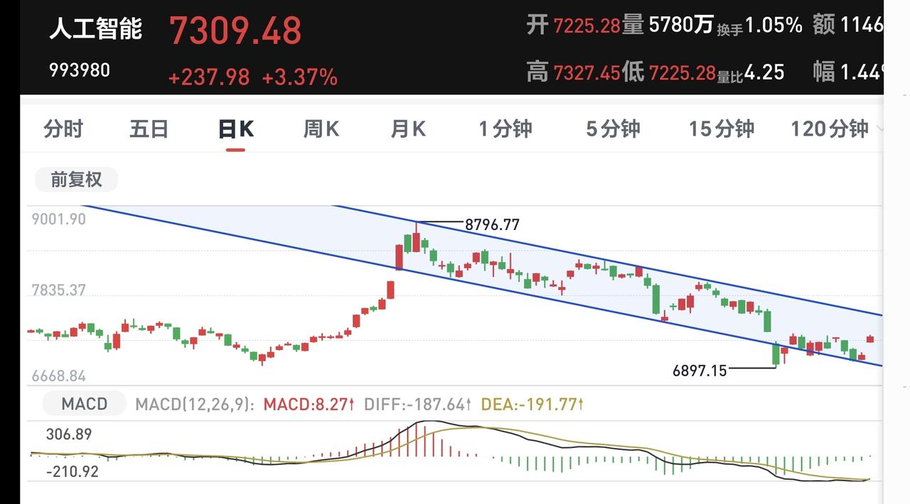 人工智能板块日线级别处于下跌通道中,这个板块今天虽然大涨,但并没有能够上涨突破下跌通道的上轨线,今天的大涨并没有改变日线级别的下跌趋势,短线持有的人继续注意风险。
