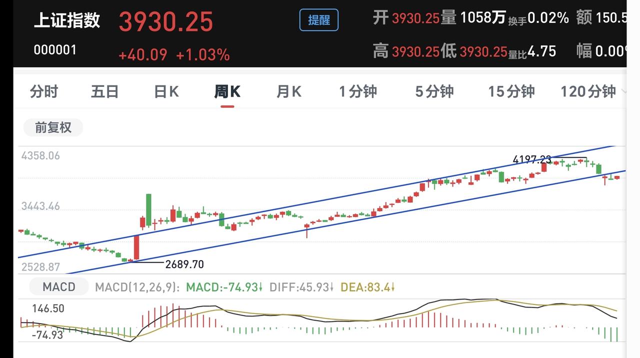 看下面的截图3,这是上证指数周K线图,今天的上涨并没有能够重新回到日线级别上涨通道中,如果本周五之前不能重新回到这个上涨通道内,上证指数周线级别就处于有效破位中。