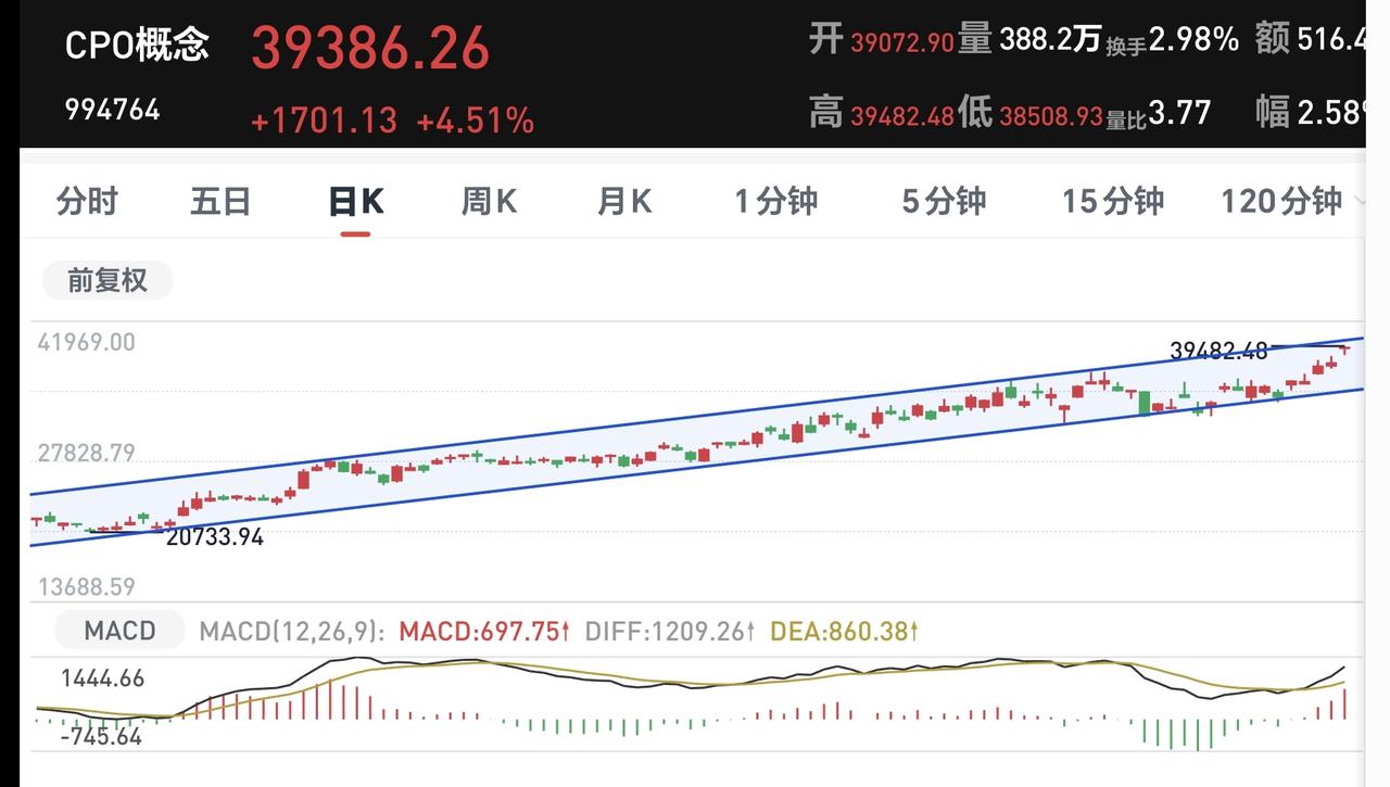 CPO板块日线级别处于上涨通道中,今天的大涨更加接近了上涨通道的上轨线,这样的位置,持有的人可以继续持有,没有的人不建议追涨进场。