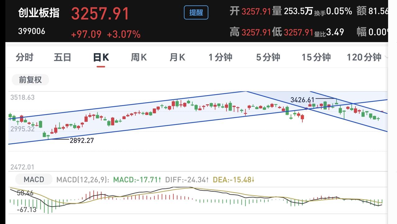 看下面的截图3,这是创业板指日K线图,今天的高开已经突破了日线级别下跌通道的上轨线,继续观察盘中会不会有回落,会不会重新回落到这个下跌通道内,但如果盘中继续上涨,就要观察这个突破会不会是有效突破,如果是有效突破,创业板指日线级别短期下跌趋势就有可能会被改变。