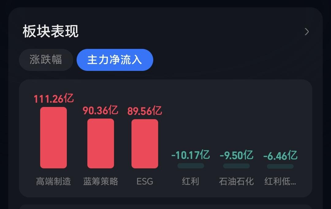 整个市场主力资金净流入最多的三个板块是:高端制造板块,蓝筹策略板块,esg板块,主力资金净流出最多的三个板块是:红利板块,石油石化板块,红利低波板块。