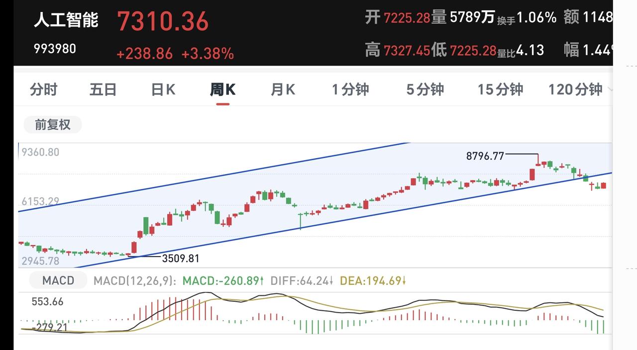 人工智能板块周线级别处于上涨趋势破位中,今天的大涨并没有能够重新回到原来的上涨通道内,今天的大涨并没有改变周线级别趋势破位的状态,长线持有的人继续注意风险。