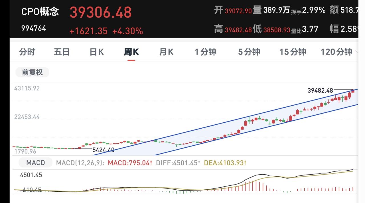 CPO板块周线级别处于上涨趋势中,今天的上涨已经突破了上涨通道的上轨线,有可能会进入加速走势。但凡是在上涨通道上轨线附近的时候,持有的人都是可以继续持有,也都是不建议追涨进场。