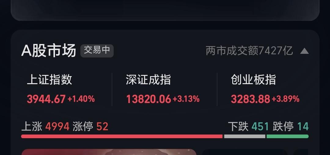 市场上涨4994家,下跌451家,上涨家数大幅度超过了下跌家数,涨停52家,跌停14家,从涨停家数看,不够,从跌停家数看,有点儿多,说明市场并不是很强。