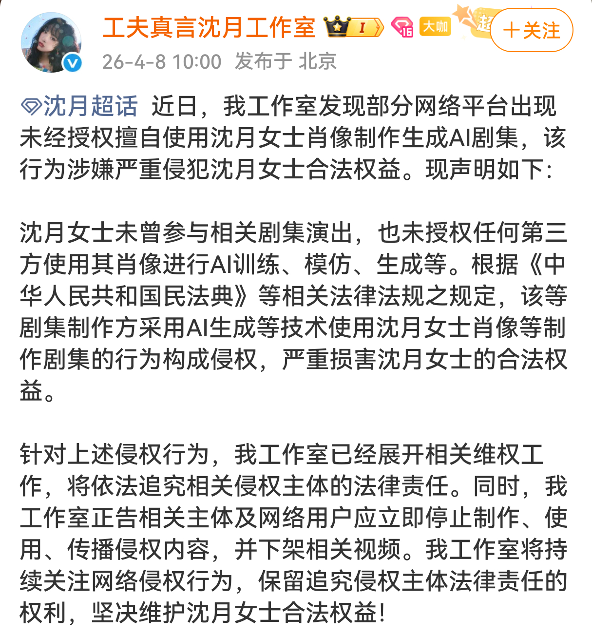 沈月工作室发布关于ai剧集侵权的声明,声明中表示沈月女士未曾参与相关剧集演出,也未授权任何第三方使用其肖像进行AI训练、模仿、生成等。目前工作室已经展开相关维权工作,将依法追究相关侵权主体的法律责任。