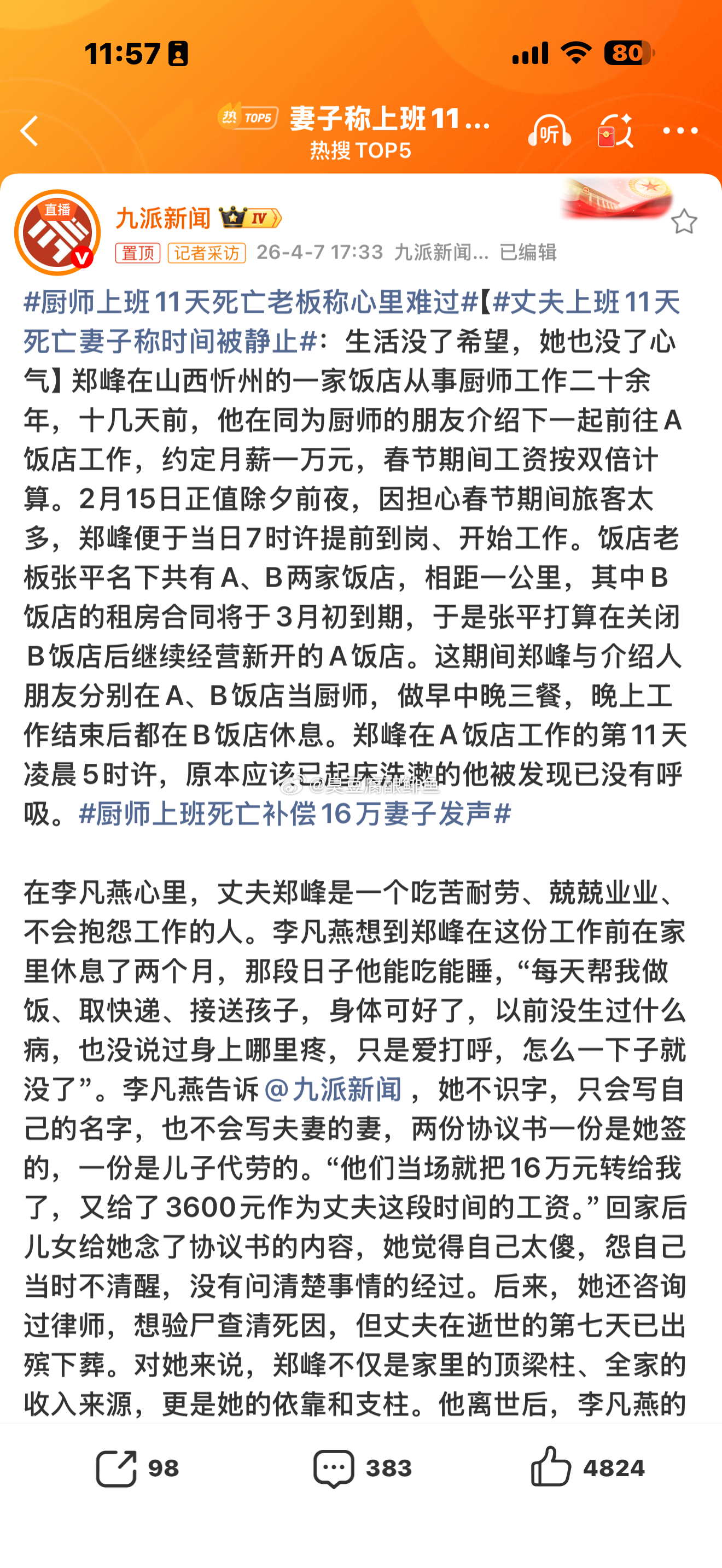 厨师上班11天死亡老板称心里难过翻译:钱赔了,协议签了。觉得少了,打官司也打不赢了。找媒体来道德绑架了。