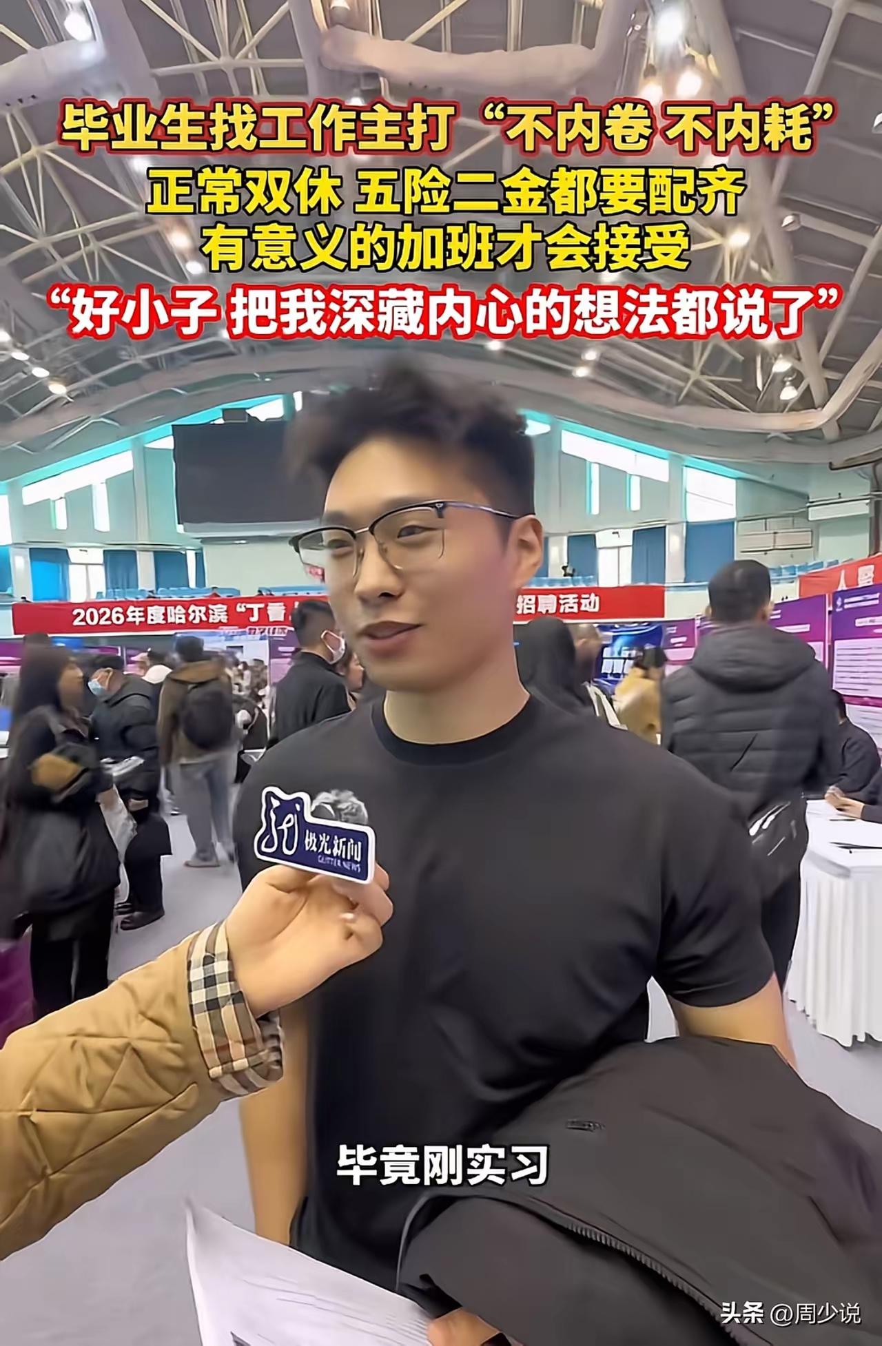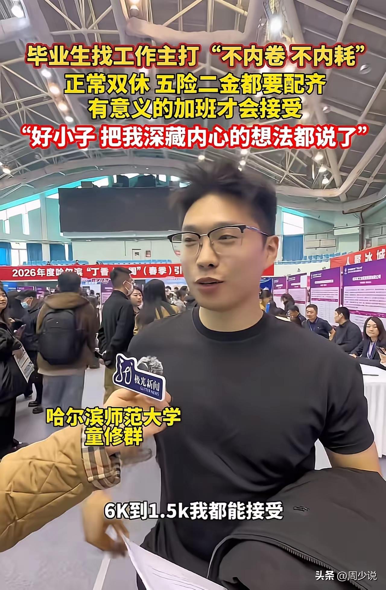 哈尔滨师范大学校招现场上,一位应届毕业生面对采访,说出了自己的需求,他表示想正常双休,五险二金都要配齐,有意义的加班才会接受。除此之外,薪资方面,六千到一万五都能接受,越高越好! 信息来源:极光新闻 网友评论: 年轻人有想法有要求,没毛病,其实大多数人的起薪想要8000起,当然越多越好,最好管吃管住,双休不加班,年年涨薪,年底奖金丰厚,节假日福利,上班主打自由,当然劳动法规定的五险一金必须达到,达不到理想状态就离职再找下家。所以建议没有能力养员工的企业就不要开了。 提出需要没错,但你得有真才实学,说实在话,除了少量的应届大学生外,大学生在社会上,尤其是企业里受欢迎的程度并不高,企业更愿意选择有经验的人,所以刚毕业,还是沉下心来先积累经验为好! “正常双休,五险二金都要配齐”,“六千到一万五”,许多人认为这是正常的要求,我也认为这很正常,就业本就是双向选择,没有对错。这样的岗位社会上肯定有,但这样的岗位会选择一个刚毕业的大学生吗?