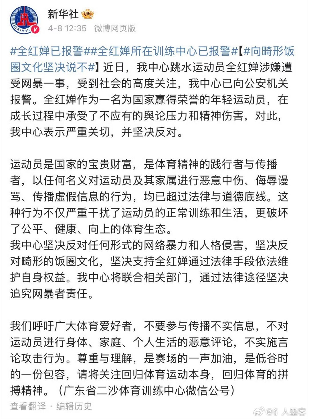 全红婵已报警 支持全红婵。那些网暴者严厉处理。对运动员心理造成伤害和干扰了