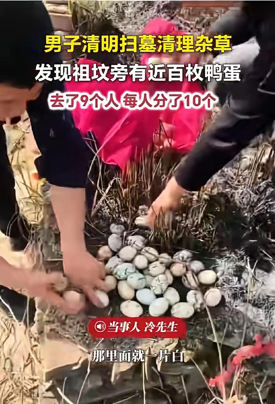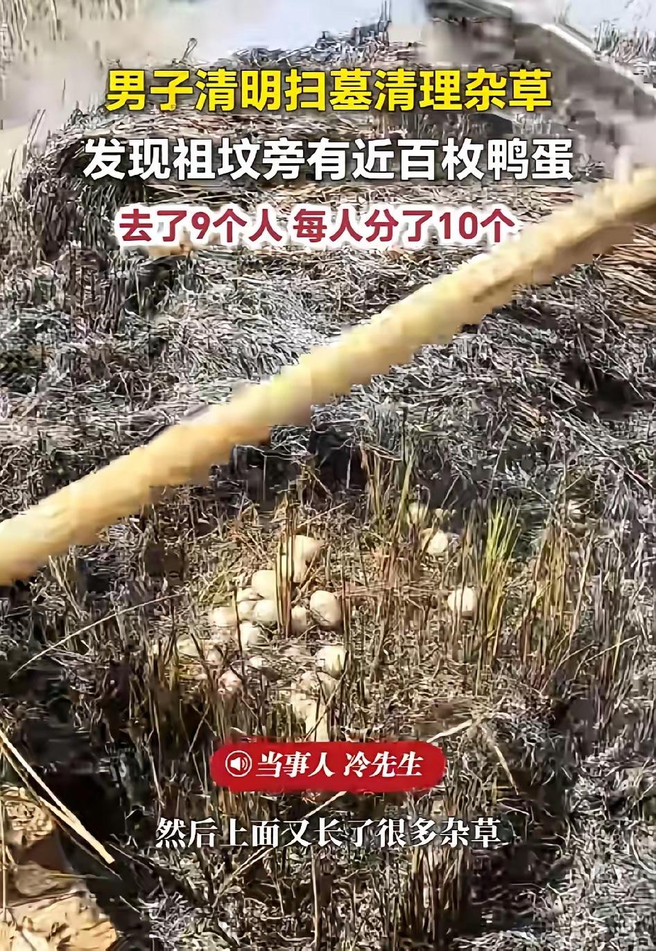 太惊喜了!江西九江一家9口清明扫墓,本来只是安安静静尽份孝心,谁能想到,刚扒开祖坟边的野草,竟一窝近百枚鸭蛋赫然露在眼前,又惊又喜当场平分,笑着说这是先祖给的清明礼物,一桩再平常不过的祭扫小事,直接成了全网都羡慕的暖心巧合。