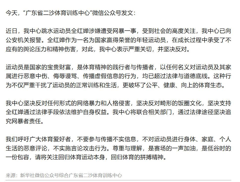 真怒了!全红婵被网暴3年,训练中心直接报警!畸形饭圈必须滚出体育圈! 家人们!今天全网都炸了!咱们的跳水小冠军全红婵,长期被网暴,实在忍无可忍,训练中心直接报警了!全红婵已报警全红婵遭受网暴已报警 你敢信?一个282人的大群,公告直接写着:禁止攻击其他运动员,全红婵除外! 这哪是粉丝群?分明是“霸凌群”!天天在里面骂她、造她黄谣、给她起侮辱性外号,连家人都不放过。更气人的是,里面居然还有队友、裁判、甚至记者,一群业内人看着她被骂,不拦着还跟着踩 ! 小姑娘才19岁啊!为国拿了多少金牌?东京、巴黎奥运一跳封神,为国家争了多少光!平时训练摔得浑身疼,比赛压力大到睡不着,结果下场还要被这群人恶意攻击、造谣抹黑 。 之前她采访时红着眼眶求:别网暴我和家人了,结果人家变本加厉!AI换脸造她假视频、恶意剪辑说她不努力、连她老家都被围堵直播 。好好一个阳光小孩,被折磨到不敢看手机、天天做噩梦! 这次官方直接硬刚!报警、追责、绝不姑息,坚决向畸形饭圈说不 ! 体育圈不是娱乐圈,运动员是为国拼搏的英雄,不是你们拉踩、网暴的工具!拿冠军要夸,状态差要包容,而不是搞人身攻击 ! 支持全红婵维权!必须揪出那些网暴的人! 你平时见过这种恶心的网暴吗?你觉得该严惩这些施暴者吗?来评论区聊聊,一起为小红撑腰!