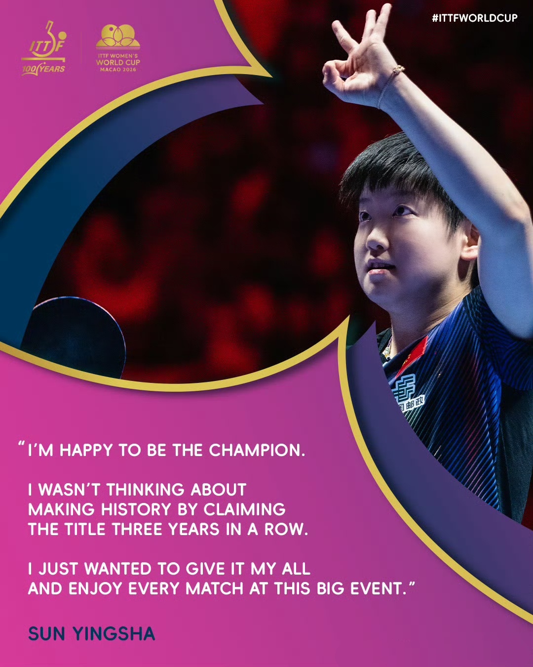 孙颖莎:“拿到这个冠军内心非常开心,我并没有刻意去想连续三年夺冠、从而创造历史,我只是全力以赴打好每一场球,并尽情享受这大型赛事的每一场比赛。”孙颖莎创造历史