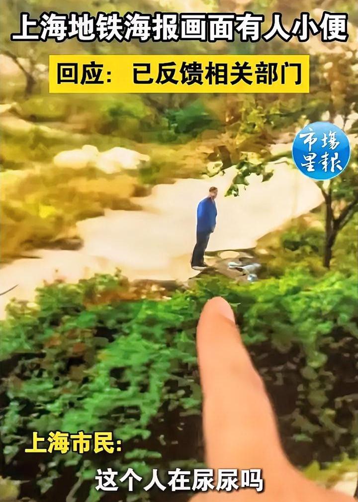 这位网友眼睛真尖,发现上海地铁一张宣传海报上,一名男子在路边撒尿,于是将此事反映给相关部门。