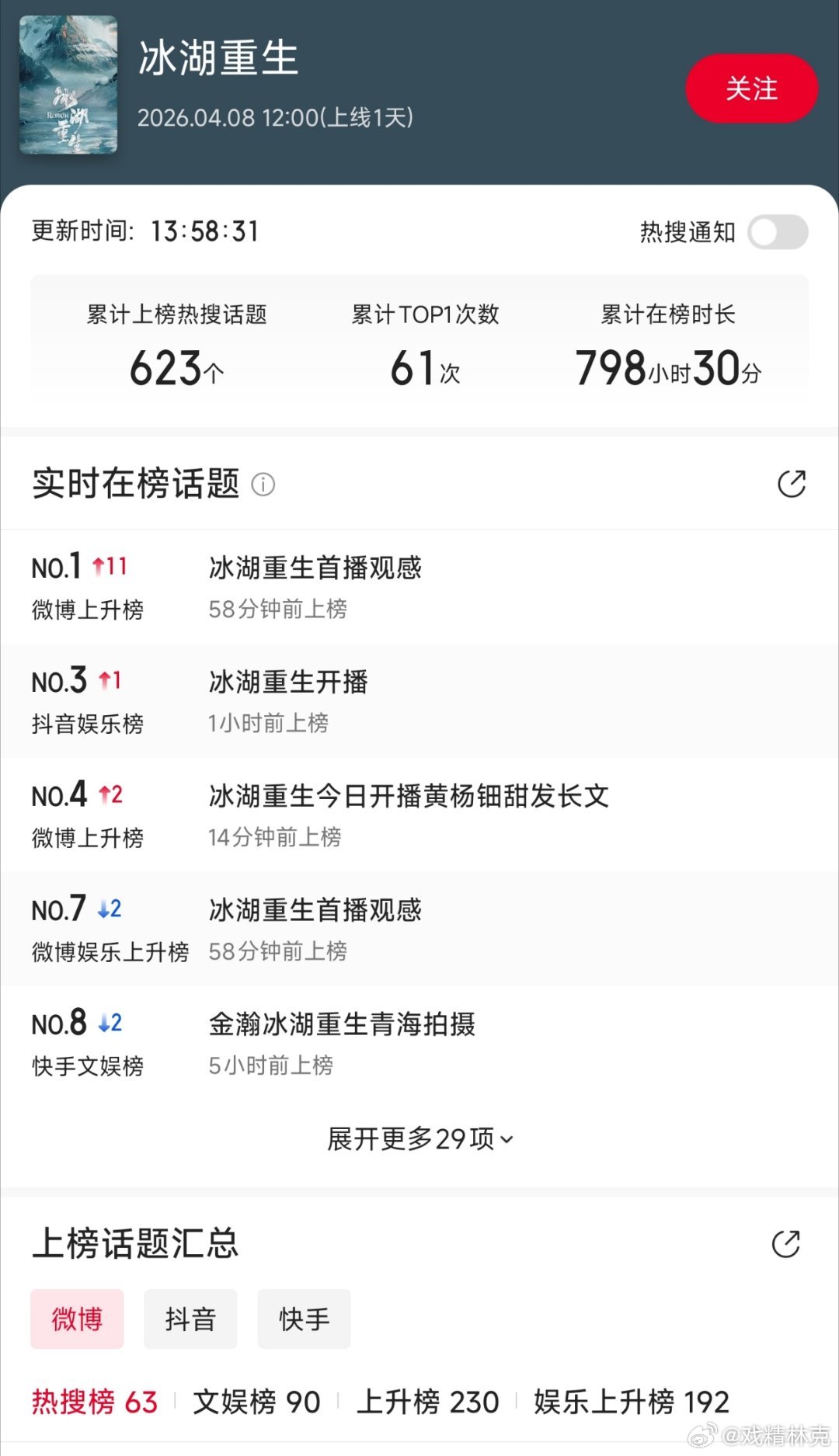 李昀锐、黄杨钿甜、张康乐冰湖重生 双平台都有专栏和固屏,前期翻炒热搜已破600,就这待遇还说不好?不重视?只是开播表现太拉了,目前同期热度综合和血扑的江湖夜雨十年灯差不多水平。耀客今年估计要连扑一片大剧 冰湖重生开局0广