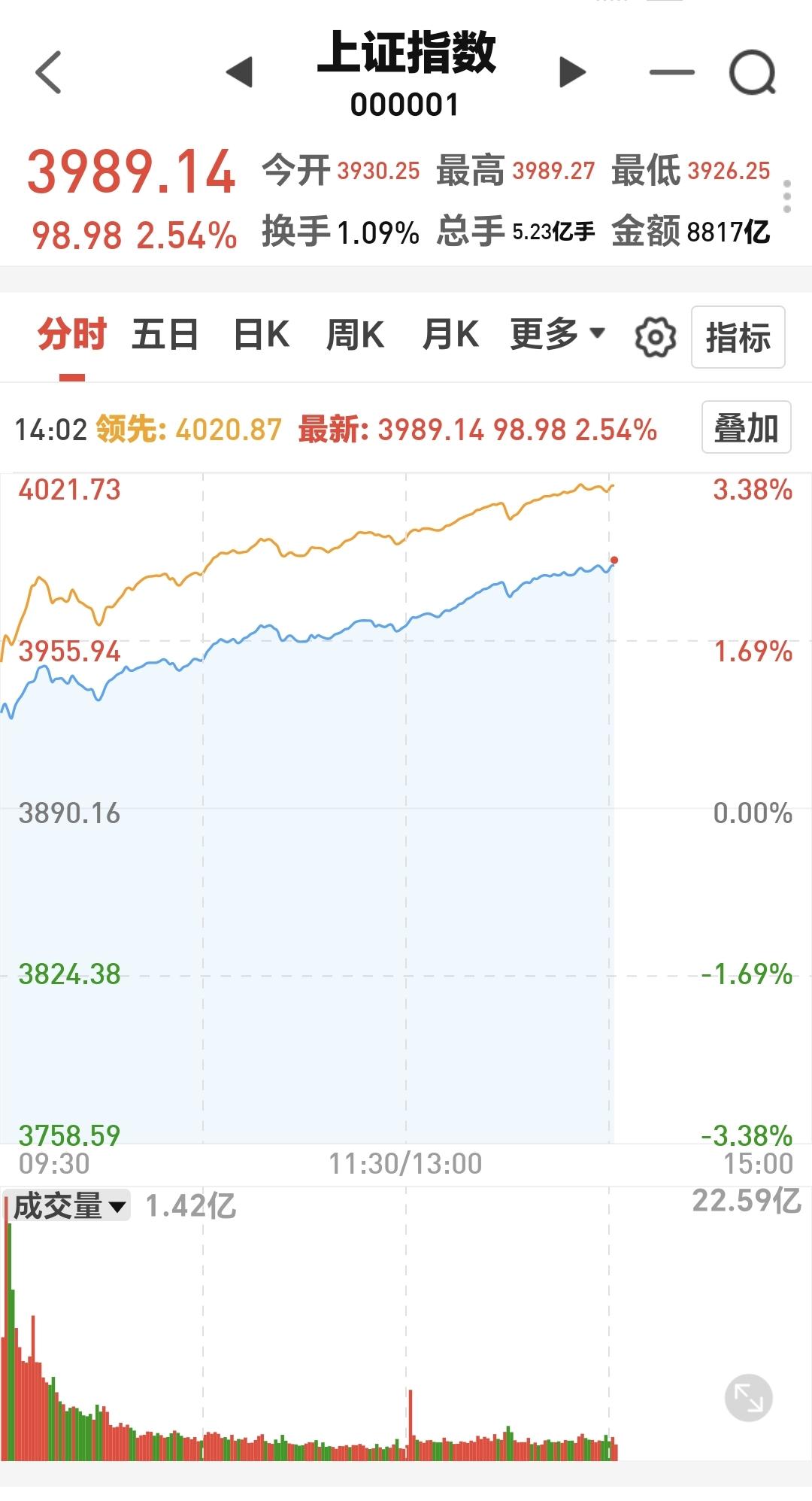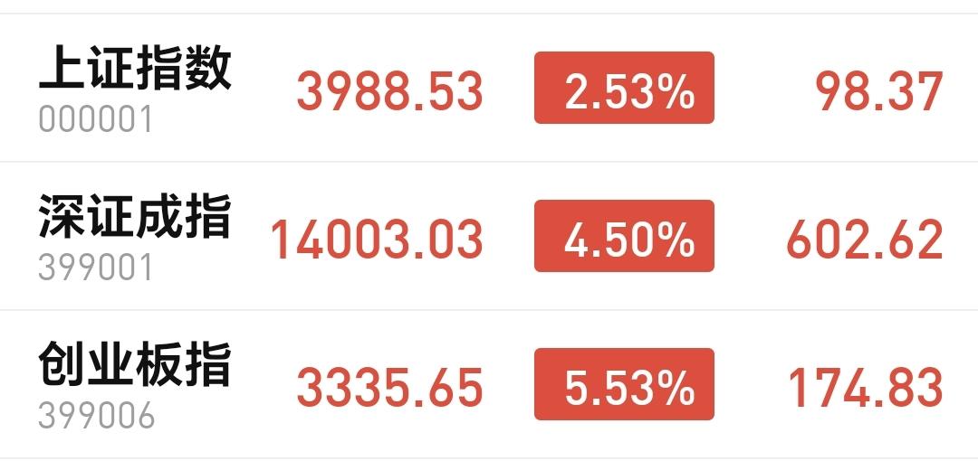 现在指数继续上涨过程中,创业板指上涨了5.53%,盘中点位3335点,上证指数上涨了2.53%,盘中点位3988点。