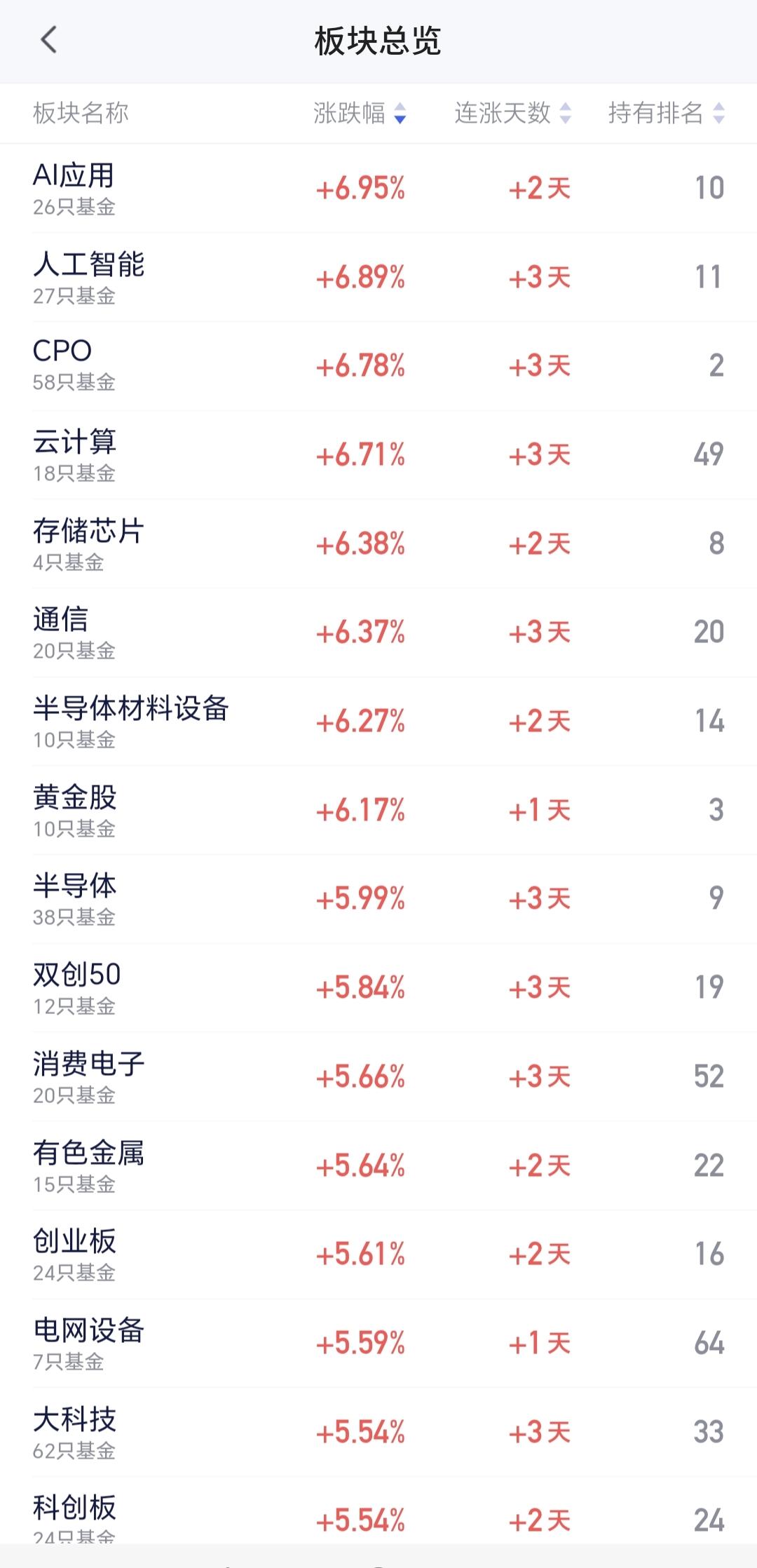 整个市场上涨幅度最大的三个板块是:AI应用板块,人工智能板块,cpo板块,下跌幅度最大的三个板块是:煤炭板块,油气资源板块,海外医药板块。