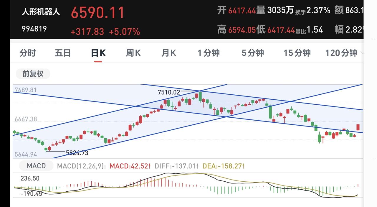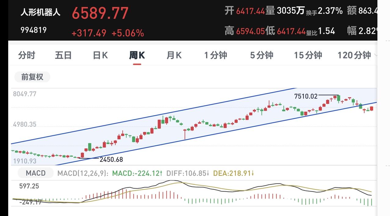 机器人板块周线级别处于上涨趋势破位中,今天虽然是大涨,但没有能够重新回到原来的上涨通道内,今天的上涨并没有改变周线级别上涨趋势的破位状态,长线持有的人继续注意风险。