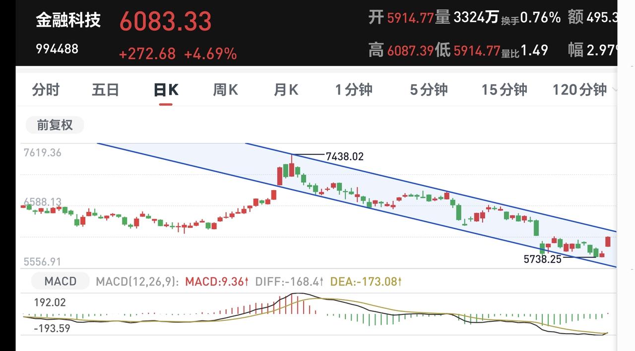 金融科技板块日线级别处于下跌通道中,今天的大涨并没有能够突破这个下跌通道的上轨线,今天的大涨并没有能够改变日线级别的下跌趋势,短线持有的人继续注意风险。