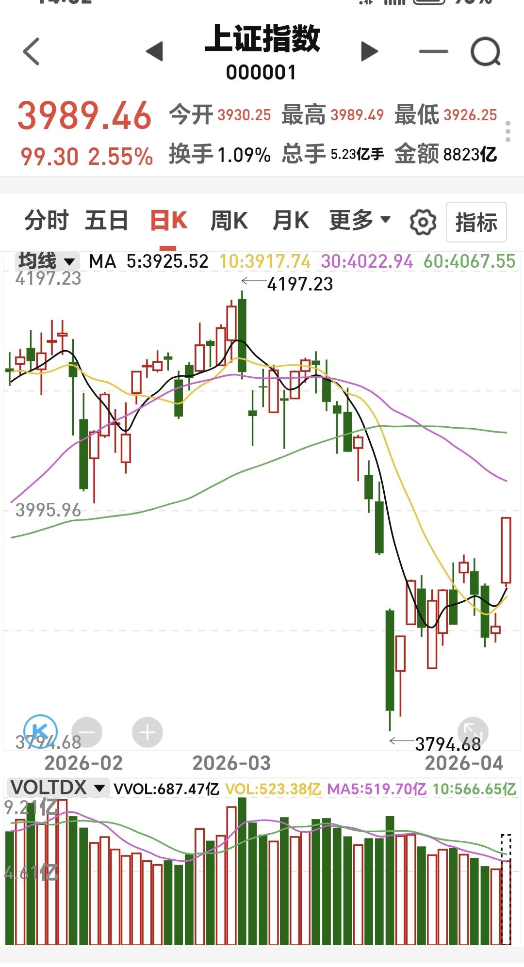 盘中最高点位3989点,还没有能够突破3996点,也就是还没有到达中等强度反弹的位置,继续观察,今天能不能突破3996点,近期也都要观察着这个点位,如果突破了3996点,下一个关注的点位就是强反弹的4043点,如果突破了4043点,大概率就有反转的走势。