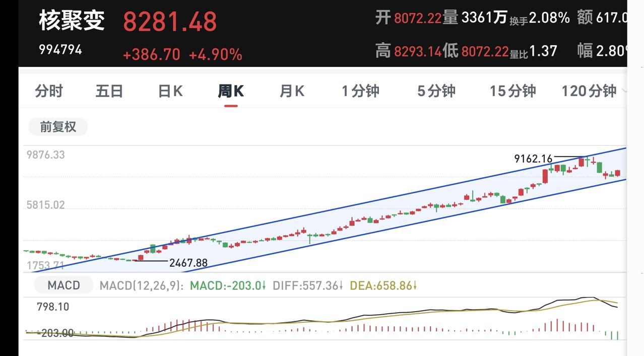 可控核聚变板块周线级别处于上涨通道中,今天的上涨并没有改变这个板块周线级别的上涨趋势,长线持有的人可以继续持有。
