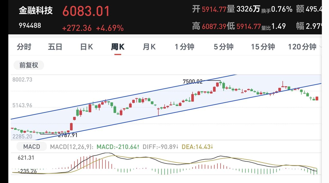 金融科技板块周线级别处于上涨趋势破位中,今天的上涨并没有能够重新回到原来的上涨通道内,今天的上涨并没有改变周线级别的上涨趋势破位状态,长线持有的人继续注意风险。