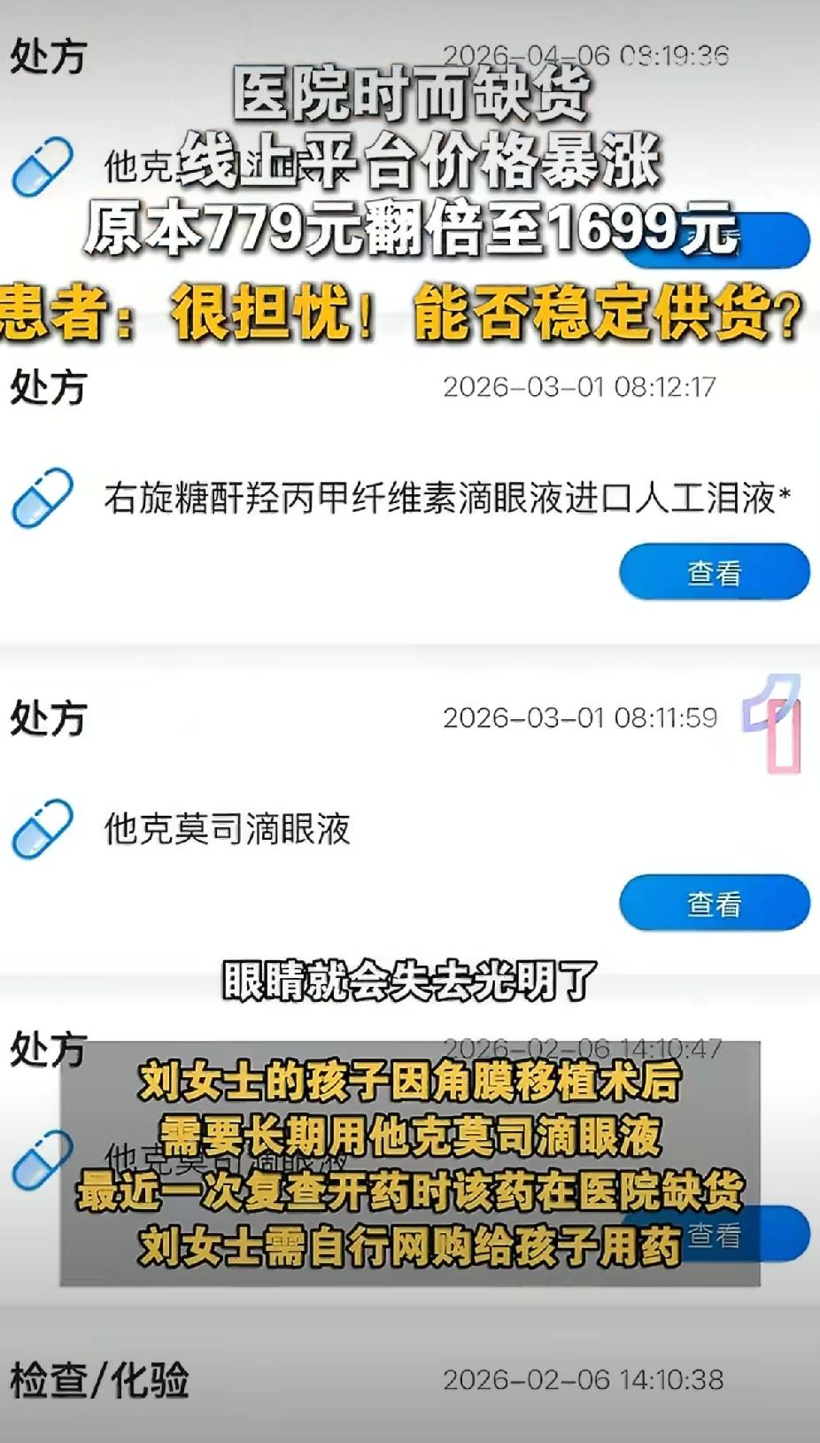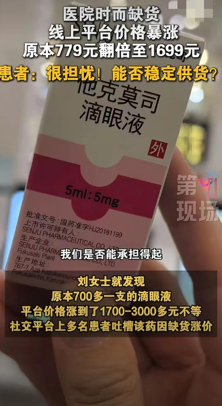 救命眼药水疯涨4倍!779元卖到3382元,角膜移植患者:停药就失明😭 家人们,今天这事真的让人心里揪得慌!广东的刘女士快被逼疯了——她做角膜移植的孩子,每天必须用的他克莫司滴眼液,医院直接断货了 ! 原本一支779元的救命药,线上平台直接飙到1700-3382元,直接涨了4倍多!这哪是买药,简直是抢钱啊!刘女士哭着说,孩子一天都不能停,一旦停药,移植的角膜就会坏死,直接面临失明风险。这哪里是眼药水,这是孩子的命根子啊! 为啥好好的药会变成这样?原来这药目前依赖日本原研进口,国内暂时没替代,供应链一紧张,中间商就趁机囤货加价。医院缺货、线上天价,普通家庭简直扛不住!更气人的是,还有人买到过假药、临期药,毕竟这药得2-8℃冷藏保存,非正规渠道根本没法保证! 别慌!现在有好消息!国家医保局、市场监管总局已经出手约谈,天价链接全下架了,药企也在加急增产。上海、广州的部分医院已经恢复供应,线上价格也在回落。大家记得优先去医院挂号开药,复诊的可以走互联网医院续方,到医院自提。实在困难的家庭,还能申请公益援助项目。 家人们,你身边有需要用这类药的朋友吗?遇到这种天价救命药,你觉得该怎么管才最有效?评论区聊聊 他克莫司滴眼液涨价 角膜移植救命药