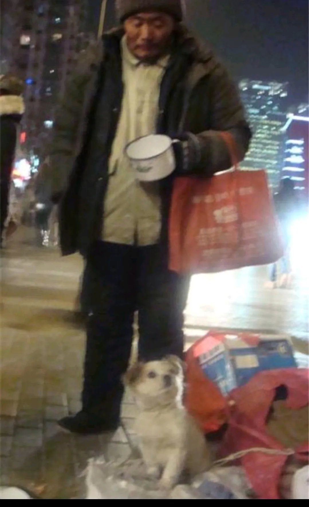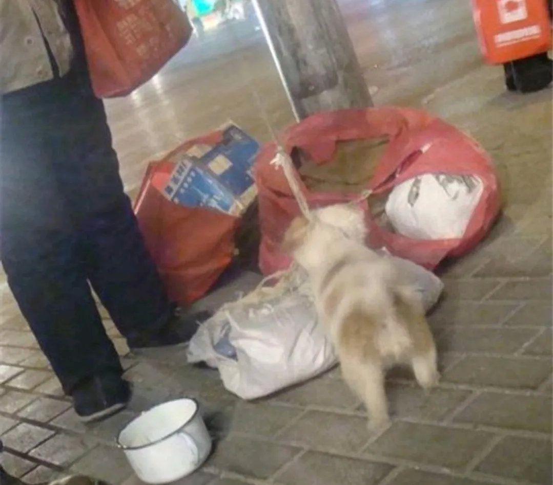这只狗狗是一个流浪汉从粪坑中救出来的,流浪汉没有钱去给狗狗看病,但是流浪汉会把自己要来的吃的分给狗狗,在流浪汉的照顾下狗狗慢慢恢复,以后狗狗与流浪汉相依为命,狗狗也替流浪汉乞讨,当有人过来时,狗狗便作揖,让人们给予施舍!