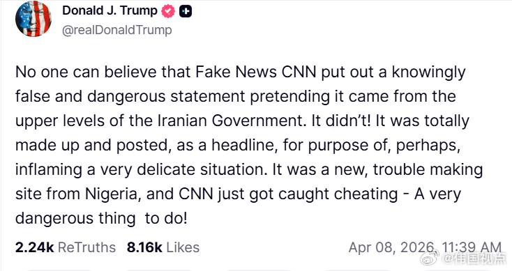 “没有人能相信,假新闻CNN竟然故意发布一份虚假且危险的声明,假装它来自伊朗政府高层。根本不是!这完全是捏造出来的,他们却把它当作头条发布,目的或许就是为了激化本已非常微妙的局势。这是一个来自尼日利亚的新麻烦制造网站,而CNN却被抓包在造假——这是一件非常危险的事!”