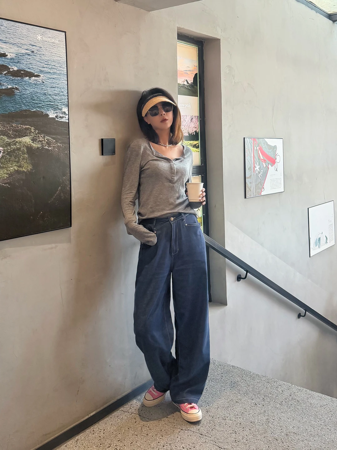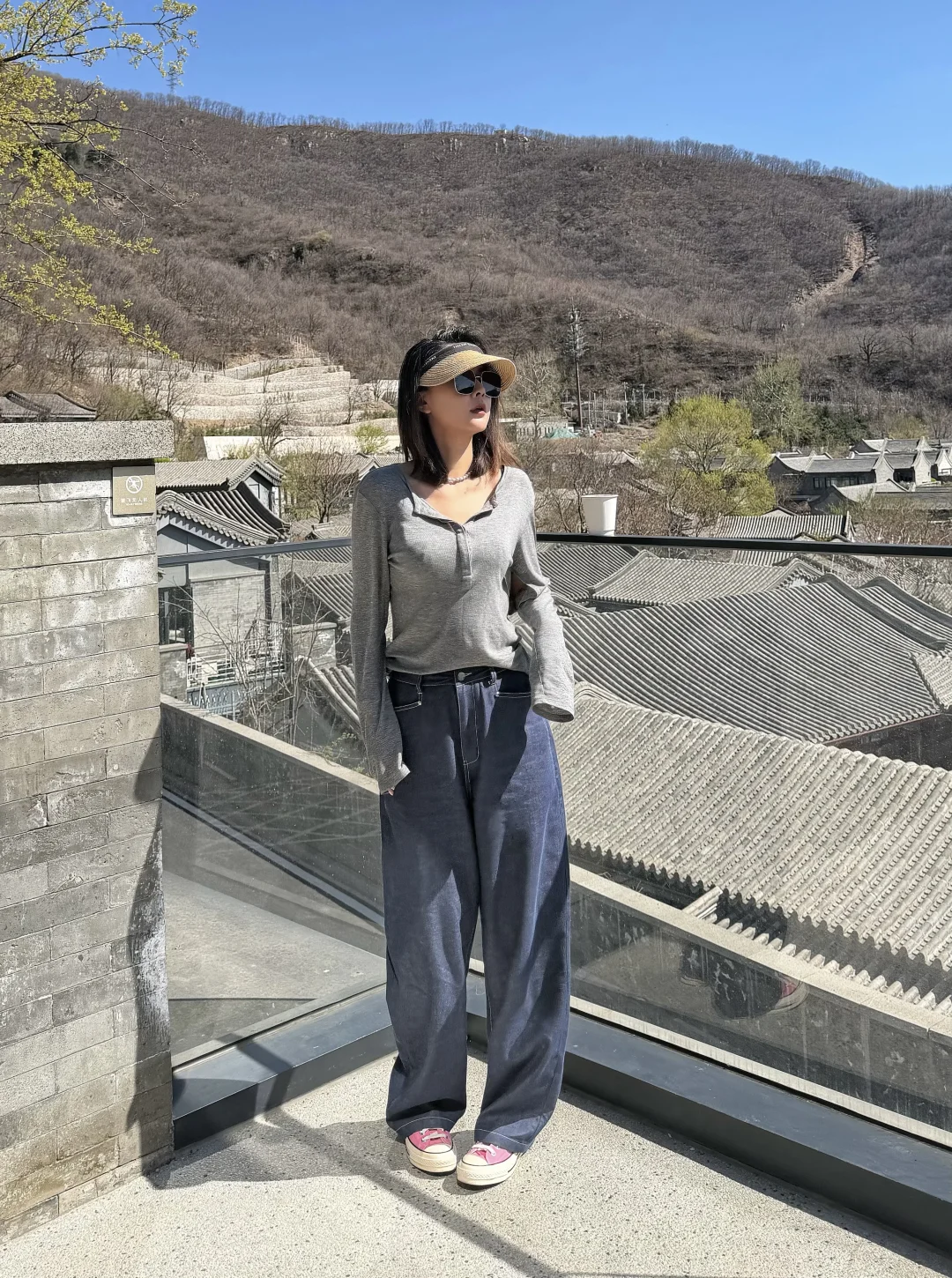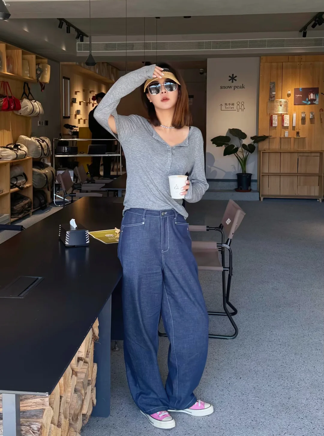 一件灰调亨利衫,搭配一条明线阔腿牛仔裤。